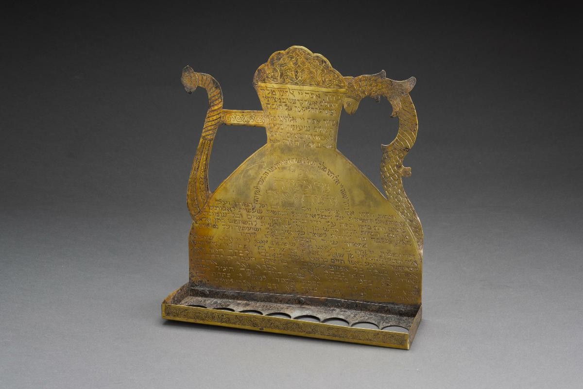 This lamp or wall sconce would have been used as part of rituals carried out to observe Sabbath, the seventh day of the week, the day of rest and abstention from work. Light plays an important role in ritualistic Jewish practice where it has been variously interpreted as a symbolic representation of God. The custom is for the mistress of the house to light at least two candles (or alternatives) before the advent of Sabbath – one to remember the Sabbath day and the other to observe the Sabbath day. The maker’s mark (“Bezalel Jerusalem”) refers to The Bezalel Academy of Arts and Design which is still in operation today. Regarded as Israel’s leading and prestigious academy of fine arts and design, it was established in 1906 by Boris Schatz, a Bulgarian sculptor, under the initial name of the Bezalel School of Arts and Crafs.
