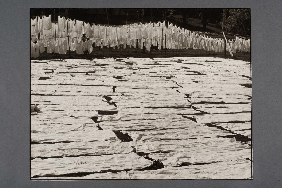 This image depicts bed sheets from Singapore General Hospital (SGH) being laundered in an open field. A washerman can be seen in the background hanging up more sheets to dry. The photograph was taken by Mr Hor Kwok Kin, a chef by trade, Hor taught himself photography in his spare time. His photographs have been featured at multiple international exhibitions and in 1992 he was awarded the Fellowship of the UK's Royal Photographic Society.