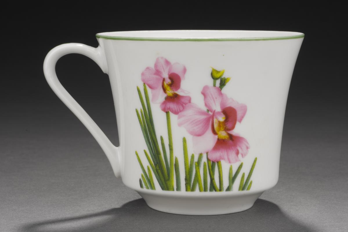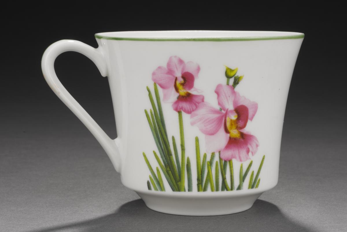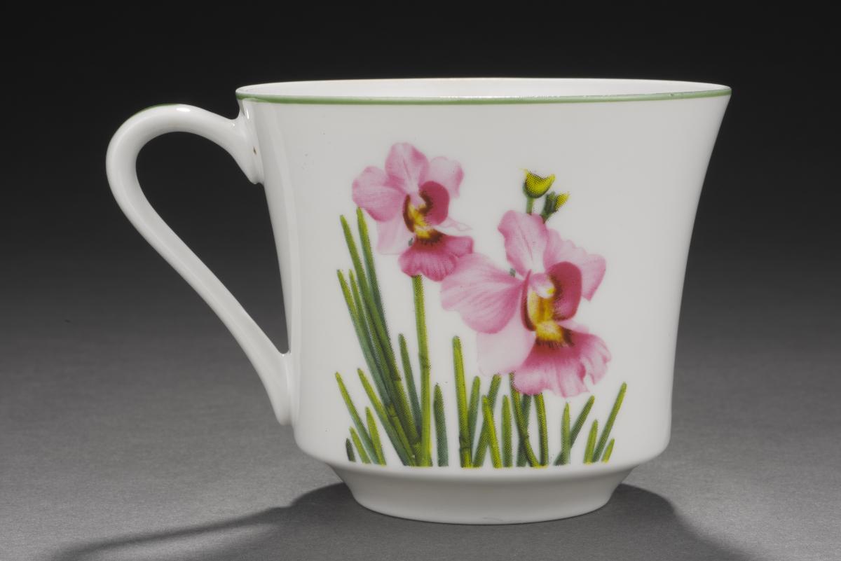 The Vanda Miss Joaquim is Singapore's National Flower, selected on 15 April 1981 from among 40 floral candidates to become one of Singapore's national symbols. Juliana Lim, the donor of this object, was working at the Ministry of culture soon after that. She was tasked with promoting the flower by contacting manufacturers, designers and textile producers to feature the orchid as a motif. The orchid became du jour on clothing such as dresses and shirts, and the orchid shirt became acceptable as formal wear. This coffee pot is part of a crockery set that was produced by La Germania and features the Vanda Joaquim orchid on it along with a short blurb about the flower.