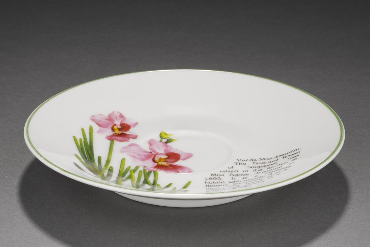 The Vanda Miss Joaquim is Singapore's National Flower, selected on 15 April 1981 from among 40 floral candidates to become one of Singapore's national symbols. Juliana Lim, the donor of this object, was working at the Ministry of culture soon after that. She was tasked with promoting the flower by contacting manufacturers, designers and textile producers to feature the orchid as a motif. The orchid became du jour on clothing such as dresses and shirts, and the orchid shirt became acceptable as formal wear. This saucer is part of a crockery set that was produced by La Germania and features the Vanda Joaquim orchid on it along with a short blurb about the flower.