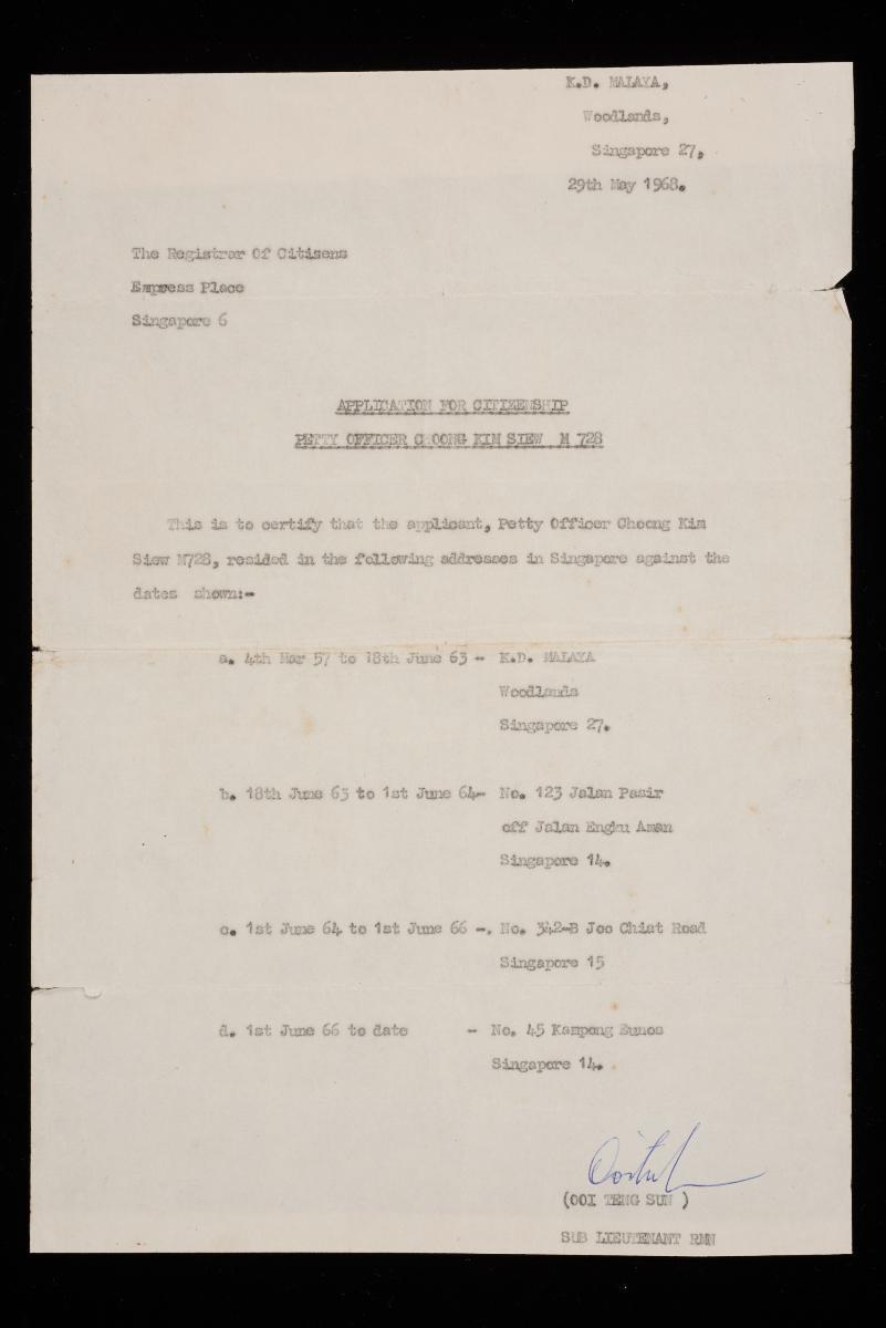 This document belonged to Choong Kim Siew, a Leading Seaman with the Royal Malaysian Navy. In 1957, Choong joined what was then known as the Royal Malayan Navy. A standard practice upon entering a military unit was to surrender one’s civilian identity card in exchange for a military identification card. Upon discharge, an officer would return his military identification card. This document was issued to Choong upon discharge, confirming that his military identity card had been withdrawn and that he could request a civilian identity card.
