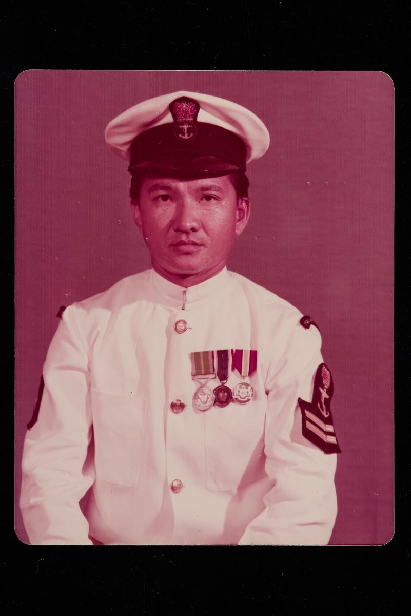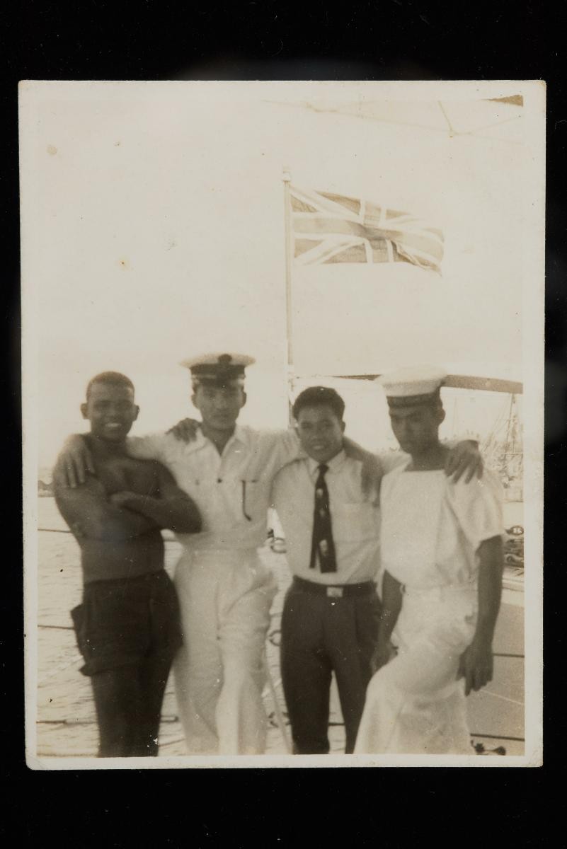 This photograph depicts officers and cadets of the Royal Malayan Navy (RMN) in a march ceremony at KD Malaya in Woodlands, Singapore. The KD Malaya was initially established in 1949 as a naval base with the setting up of the RMN predecessor, the Malayan Naval Force. KD Malaya would continue to serve as the RMN headquarters even after separation until the relocation to Lumut, Perak, in 1994.