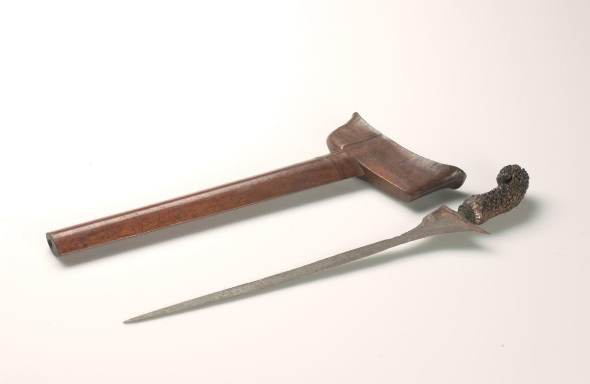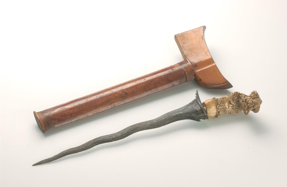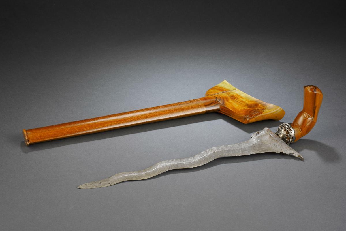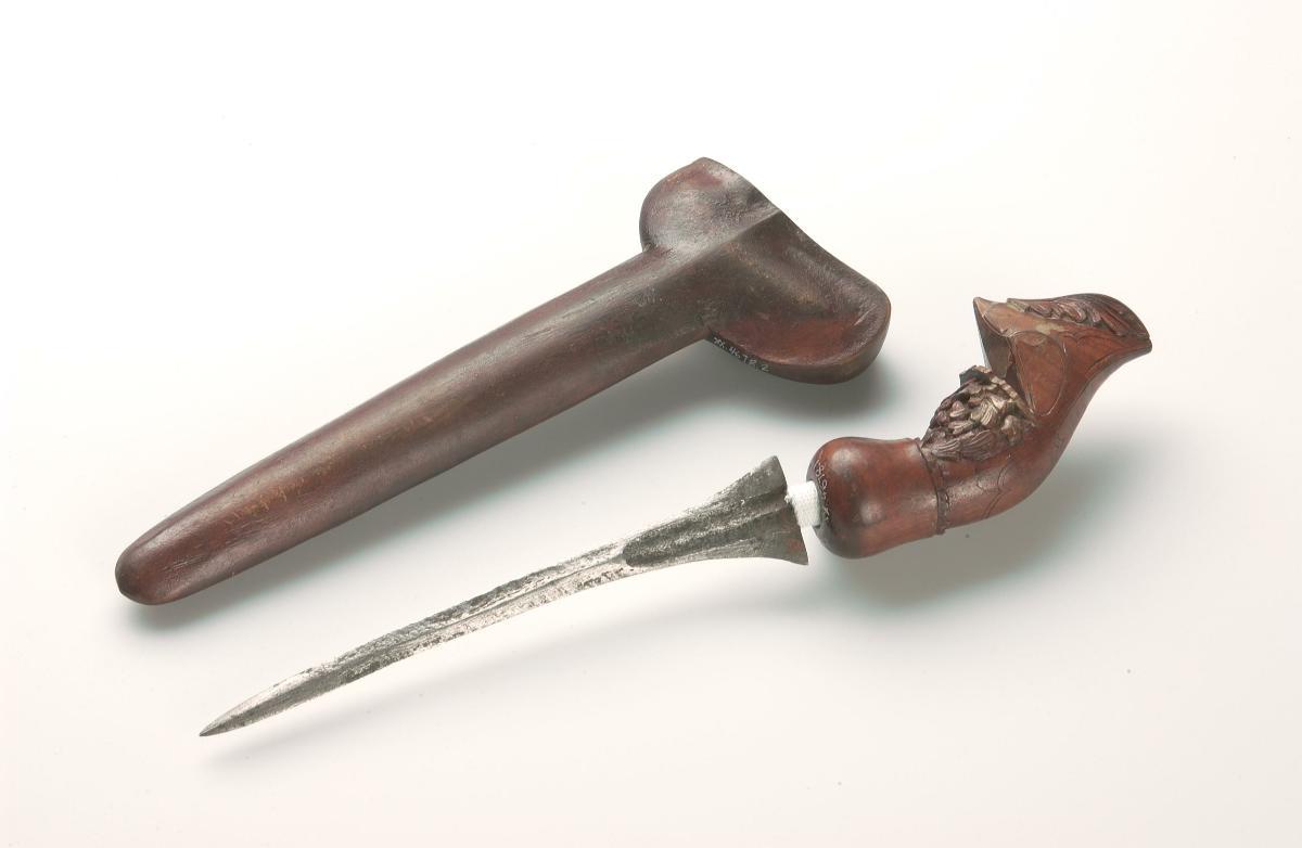 This is a Madurese-style keris which showcases unusual departures from the style and aesthetic of a conventional keris. This is evidenced from the keris' hilt, which dispenses with a keris' usual anthropomorphic and decorative convention and is instead carved in the shape of what appears to be a Dutch official or soldier, as distinguished by the figure's uniform and headgear. At the same time, there are traits of a Javanese, or broadly Indonesian, influence; firstly, the figure is seen to be wearing a pair of sumping, or wing-shaped accessories behind each ear, which are traditionally worn by performers or dancers of Javanese dances instead. Secondly, the cross-piece of the scabbard has been carved with Javanese pegon script. Innovations in keris-making such as this are part of a longer legacy in the transformations of the keris and Malay material culture, owing to religious, cultural and political shifts in the region.
