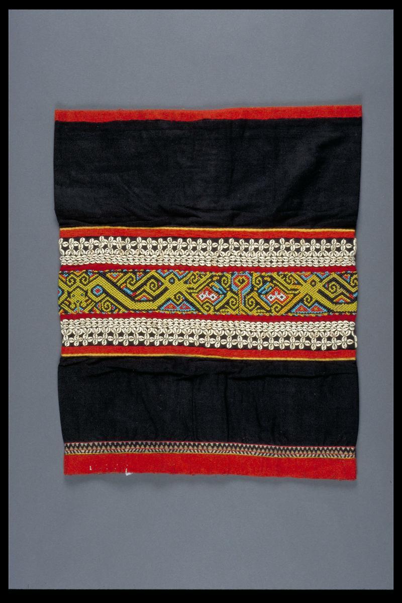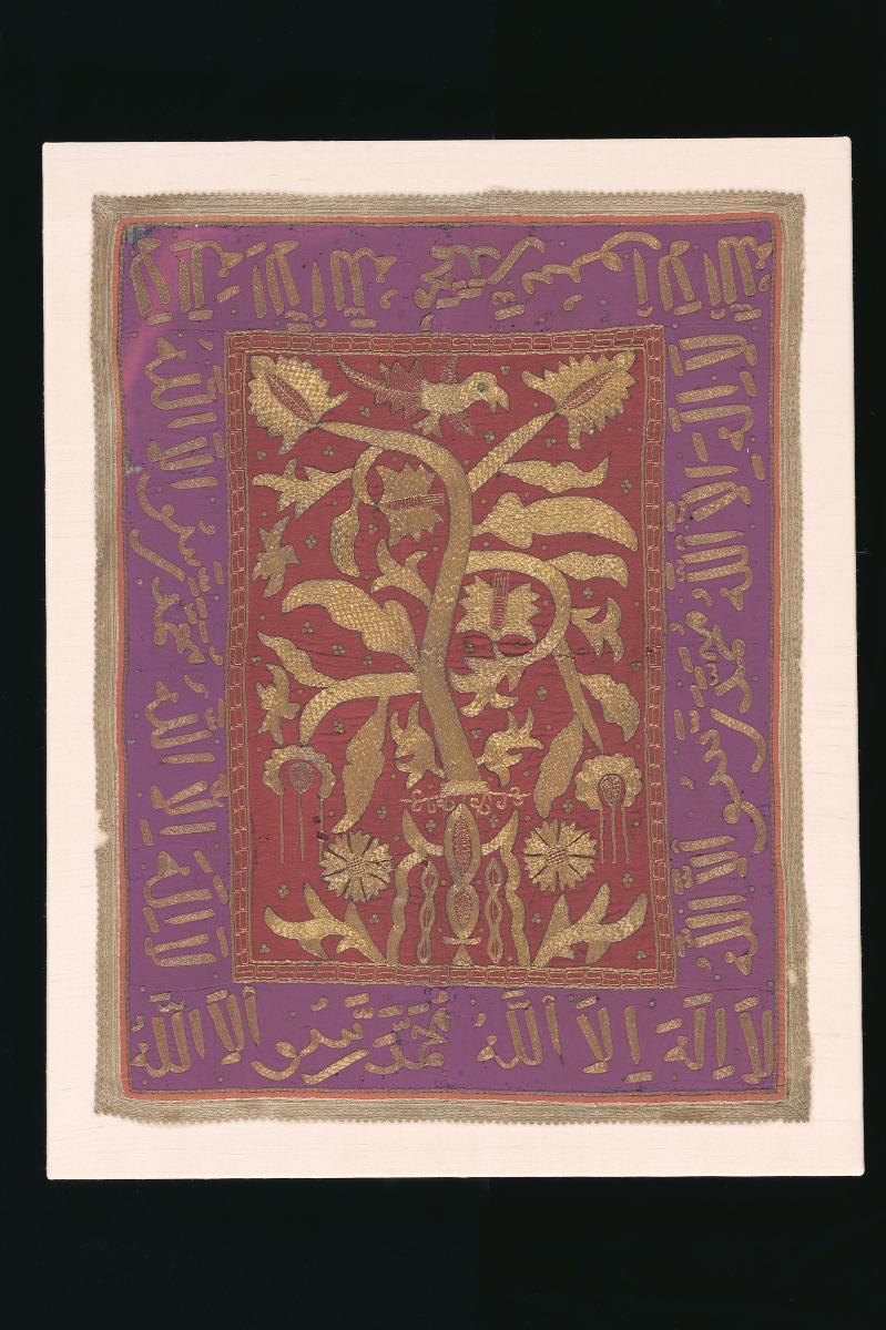 This textile, otherwise known as a tirai, would have been used as a central panel or wall hanging within the dais (pelamin) of Malay weddings - specifically within communities in Aceh, Sumatra and parts of the Malay peninsula including Perak and Kedah, where such decorative and embroidery traditions are more common. It features three 'tree of life' motifs, otherwise known as the pohon budi (or pohon beringin), which is a ubiquitous motif used on various ceremonial hangings. It also features two dragon-serpents (or naga) flank the central tree of life which may be seen as symbols of fertility. Lastly, the tree of life and naga motifs are bordered by a vinework of betel leaves (daun sirih), which are strongly associated with wedding rites.