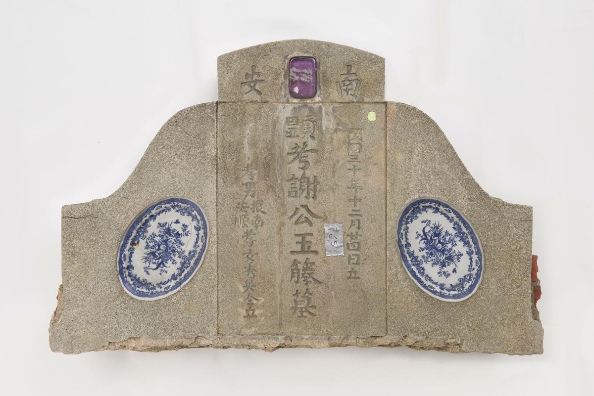 The tombstone and tomb shoulders were originally part of the grave of Mr Chen Yongxiang 陳永祥 who died in 1938. Mr Chen's grave was one of over 3,700 graves that were exhumed between 2013 and 2014 for the construction of a new road through Bukit Brown Cemetery.The tomb was erected by his children (a son and two daughters). The inscription on the tombstone indicates that he was originally from the He Shan (禾山) district in Xiamen, Fujian province, China. While the inscriptions on the tombstone are written in Chinese, it is interesting to note that the children also included their names in English at the bottom corners of the tomb shoulders. This East-West hybridity is also reflected in the way the tombstone and tomb shoulders are decorated, which sees a melding of Chinese figural decoration and Western architectural features. This blend of tomb decoration reflects the cosmopolitan outlook of people living then in the British colony of Singapore.