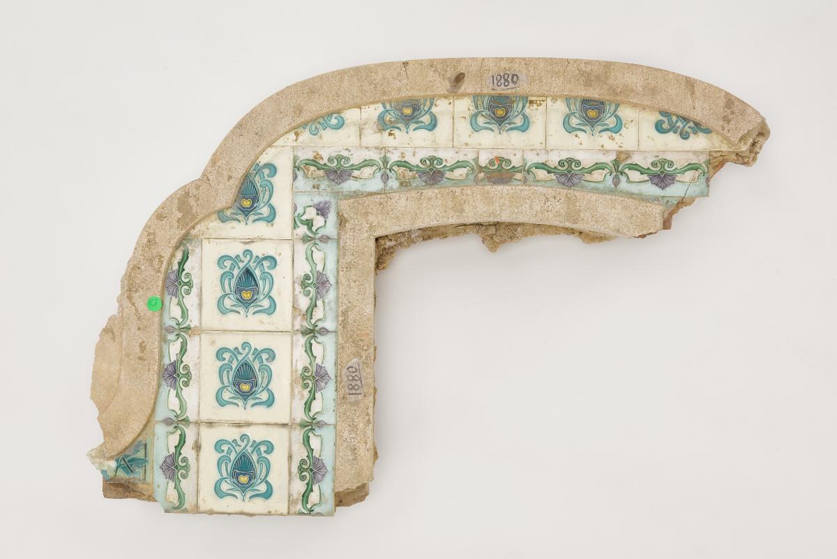 This is a segment of one of the tomb shoulders from the grave of Mdm Wee Kwye Neo who passed away in February 1927. Mdm Wee's grave was one of over 3,700 graves that were exhumed between 2013 and 2014 for the construction of a new road through Bukit Brown Cemetery. The transfer-printed polychrome tiles enhanced the visual appeal of the tomb shoulders and tomb arms, while revealing the aesthetic preferences of the deceased and her family. The tiles are also an example of the global material culture present at the cemetery; they were produced by the Henry Richards Tile Co in Stoke-on-Trent, England.