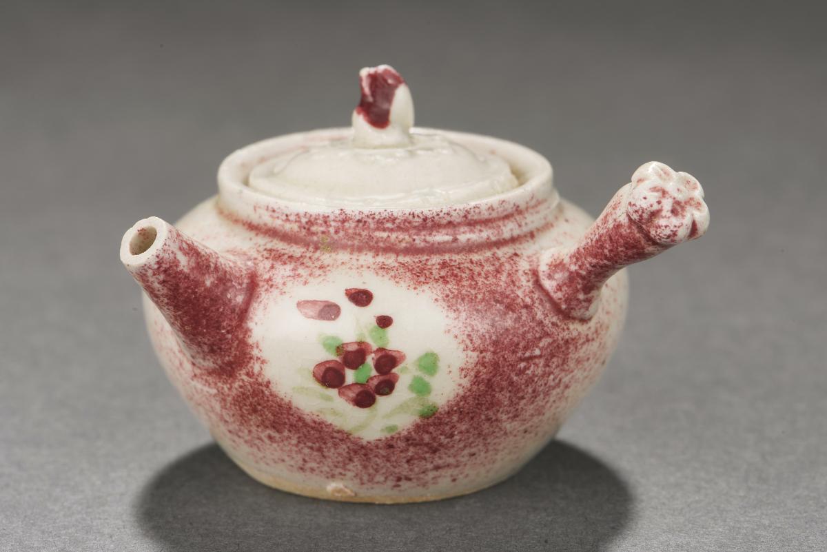 This is part of a set of miniature ceramic vessels, comprising a lidded teapot, a lidded decoction pot, a stove, a dish and three teacups, which were found in an exhumed grave in Bukit Brown Cemetery. All feature a coat of reddish pigments that was probably sprayed or blown onto the surface of the porcelain. The teapot is further hand-painted with simple floral motifs. The grave belonged to Mr Wee Joo Hock (黄如復) who passed away on 5 June 1941, at the age of 28. The practice of burying everyday objects with the deceased originated in ancient China and continued to be observed by overseas Chinese communities. These objects were intended to satisfy the needs of the deceased and/or provide them with a comfortable afterlife. Located in the central part of Singapore, Bukit Brown Cemetery was officially opened on 1 January 1922 by the British colonial government as a public cemetery for non-Christian Chinese. It came to house an estimated 100,000 graves before it was officially closed to burials in 1973.