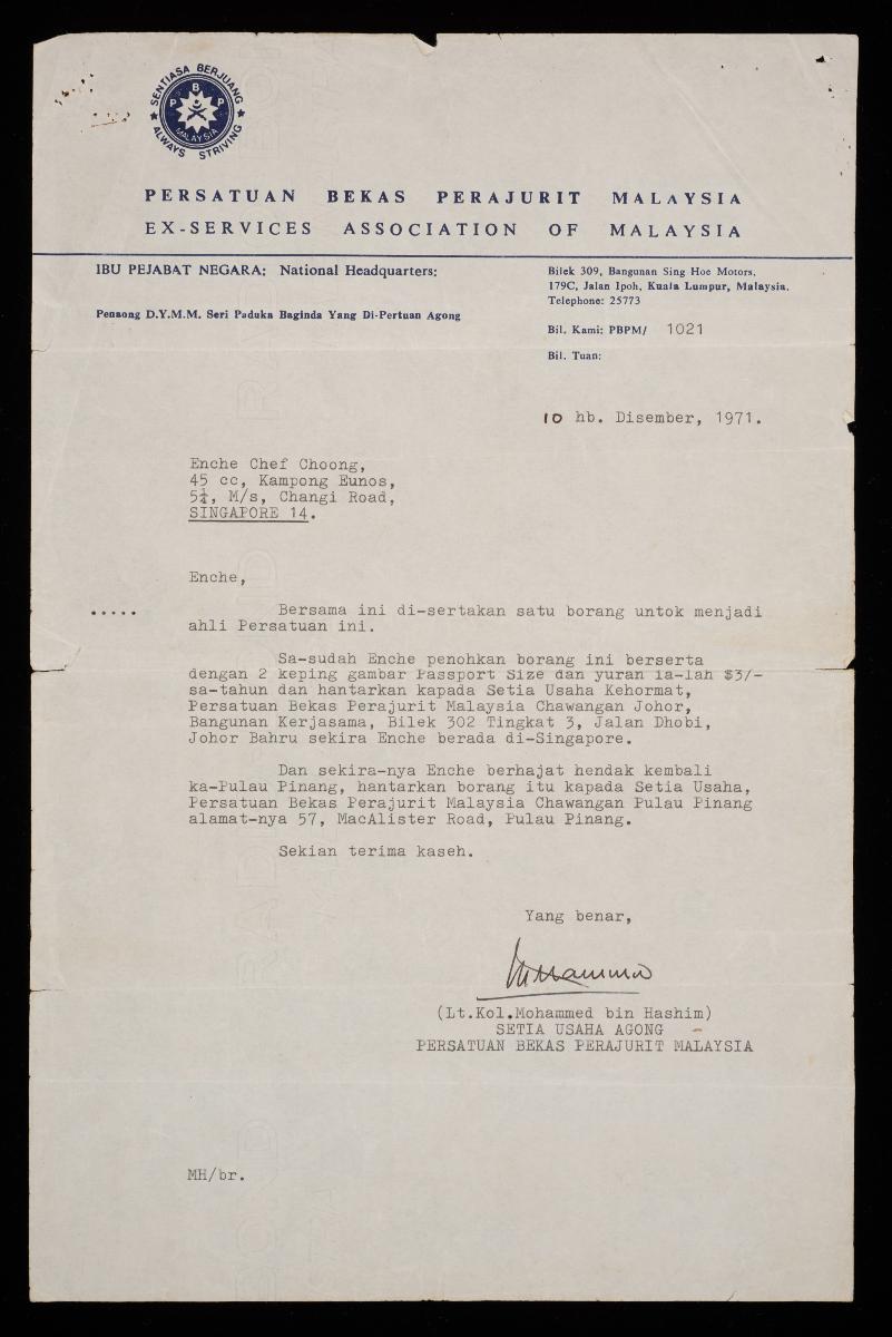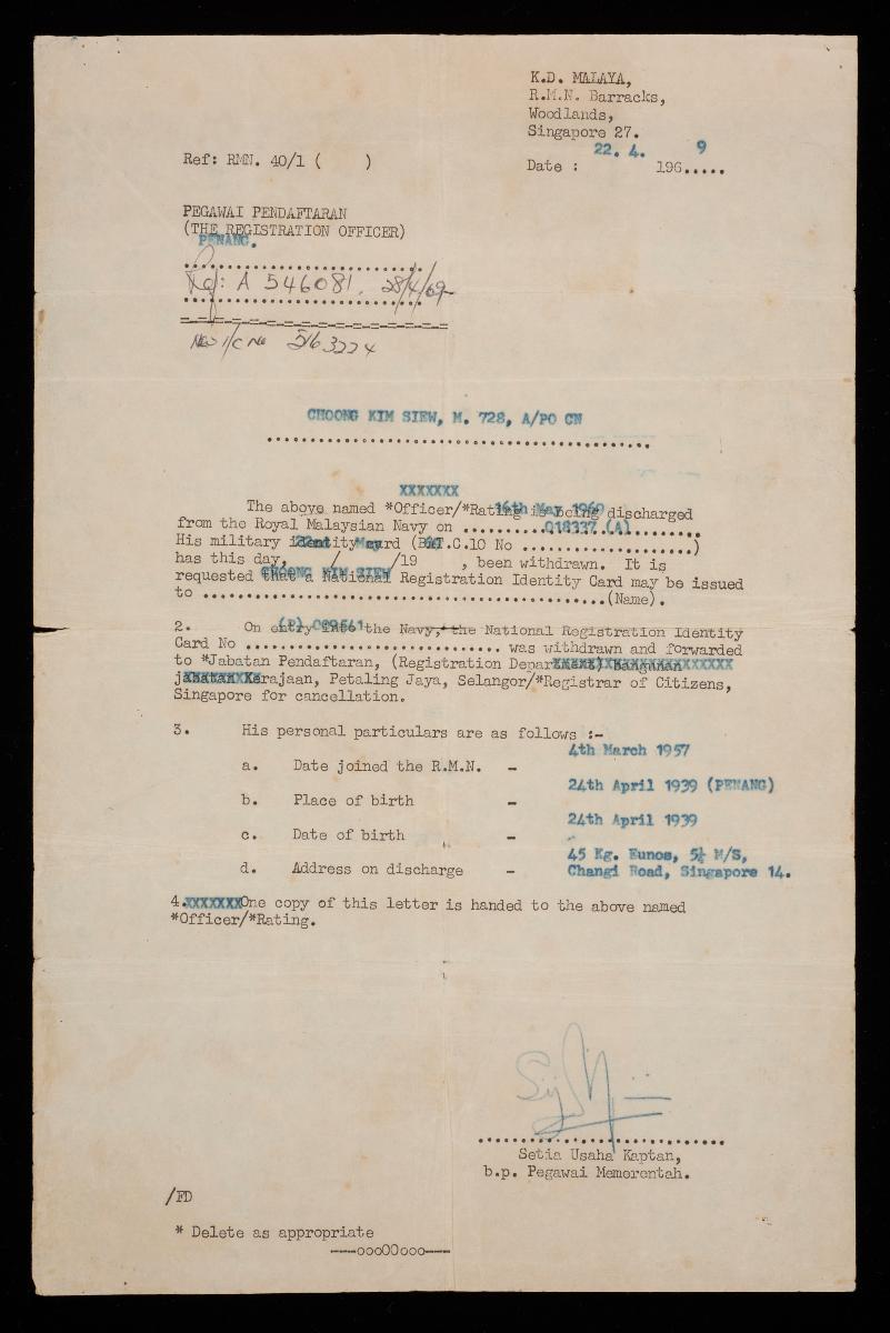 This letter was sent to Choong Kim Siew, a Leading Seaman with the Royal Malaysian Navy (RMN), and contains the record of service that he had requested from the RMN. The record lists the places in which Choong worked at during his service years 1957 to 1969: on board two ships, KD Hang Tuah and KD Mahamiru, and at KD Malaya, the RMN base in Woodlands. The letter is highly likely to be part of the requisite documentation in his application for Singapore citizenship. In the immediate period after separation between Singapore and Malaysia in 1965, discharged officers such as Choong were allowed to request for civilian identity cards and citizenship in Singapore or Malaysia.