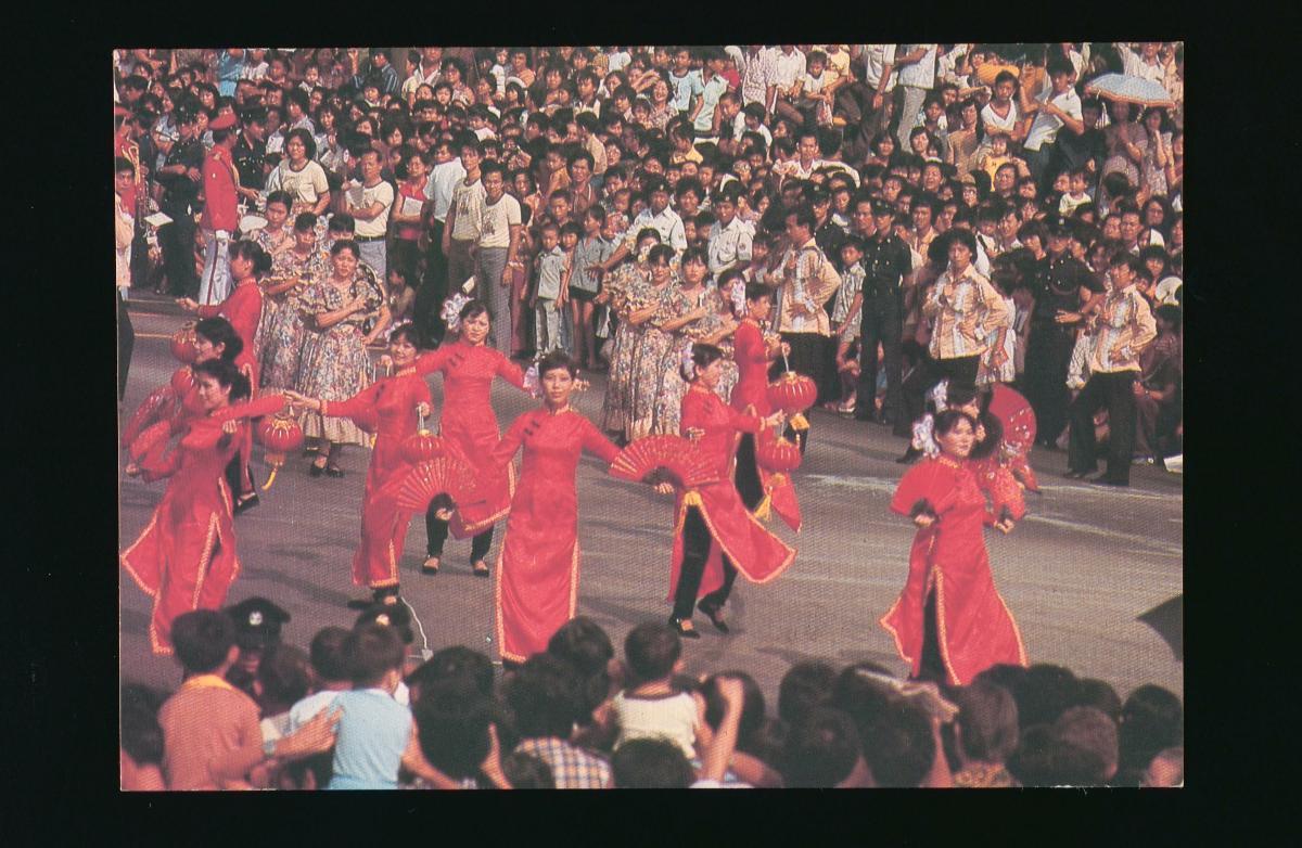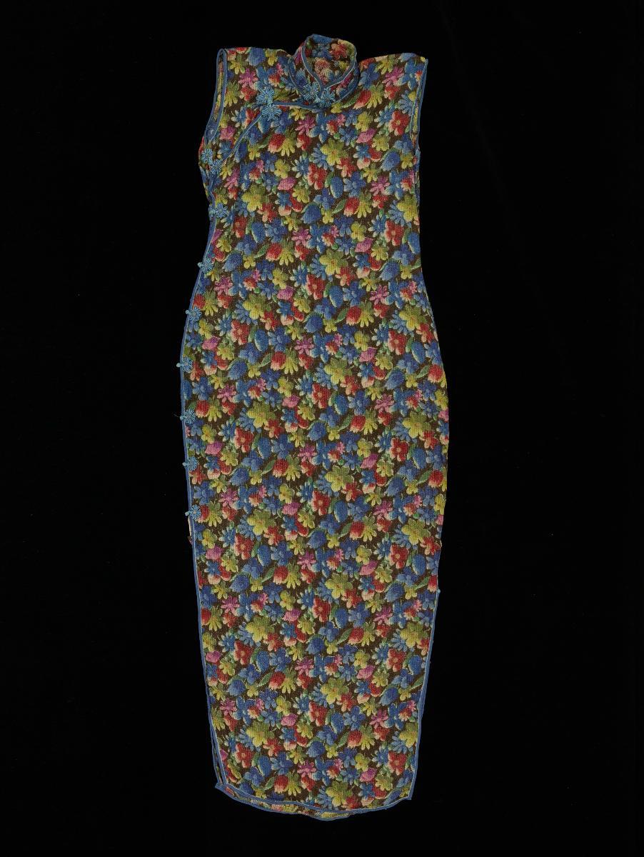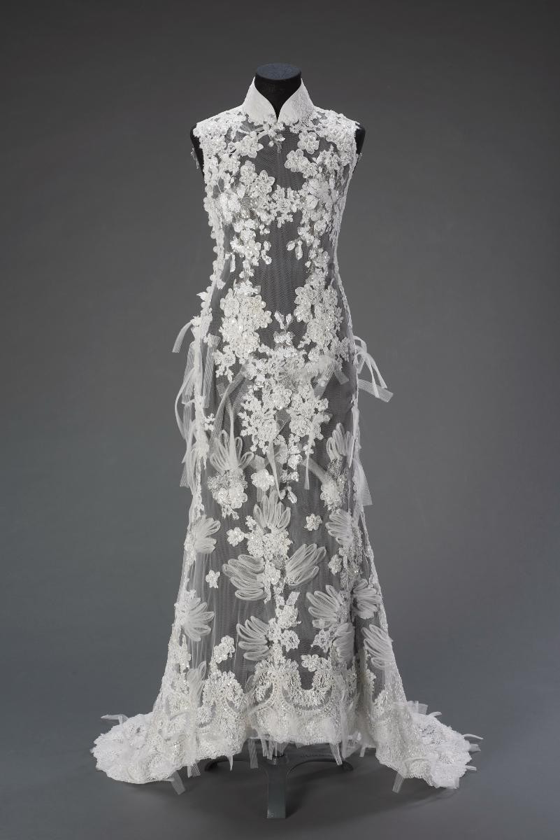 This sleeveless, full-length qipao with cape is an Ong Shunmugam custom-made original evening wear by Singapore-based designer Priscilla Shunmugam. The gown has white brocade motifs of flowers tropical foliage. The red chiffon cape that drapes from the mandarin collar to the floor adds dramatic volume to the traditional sheath-like qipao silhouette. The light cape fabric that seemingly floats when walking, is deliberately added to create movement and presence for the wearer during events. Since the early 2010s, Ong Shunmugam has been popular in Singapore for cross-cultural, modern qipaos that creatively explore fabrics beyond traditional silks, prints other than Chinese motifs, and fine structural details that challenge the qipao silhouette archetype. The donor Paige Parker wore this qipao to the premiere of Singaporean filmmaker Boo JunFeng’s The Apprentice at the 69th Cannes Film Festival in 2016. She is one of the executive producers of the film, an author, and a strong patron of Singapore’s art and fashion industry.
