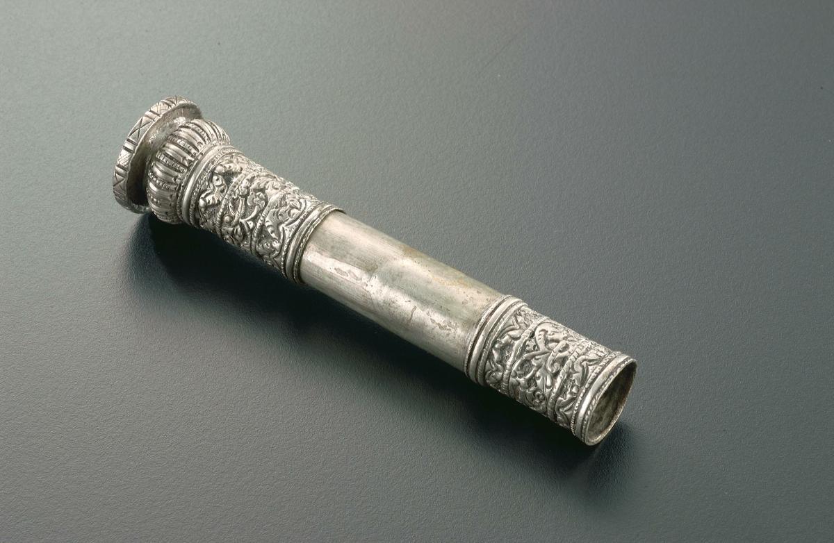 This group of three ceremonial spears belong to the Kheng Chiu Tin Hou Kong temple (琼州天后宫). The longest and second-longest spears have similar designs, featuring a spearhead coming out of a sea dragon’s mouth. The shortest spear features a Chinese calligraphy brush. Such spears were used during the yearly street procession by the temple for Mazu, the Goddess of the Sea. The longest spear bears the inscription “琼州会馆, 天后元君, 羊城天平街钜成造” (Kheng Chiu Hwee Kuan, Empress of Heaven (another title of Mazu), made at Tian Ping Street, Yangcheng [Guangzhou]. It was likely that the other two spears were also made in Guangzhou.Founded in 1854 by Hainanese clansmen, the temple and the Kheng Chiu Hwee Kuan (琼州会馆) occupied the same premises at Malabar Street until 1879 where they both moved to 47 Beach Road. The current clan association, renamed Singapore Hainan Hwee Kuan in 1994, is still located at Beach Road.