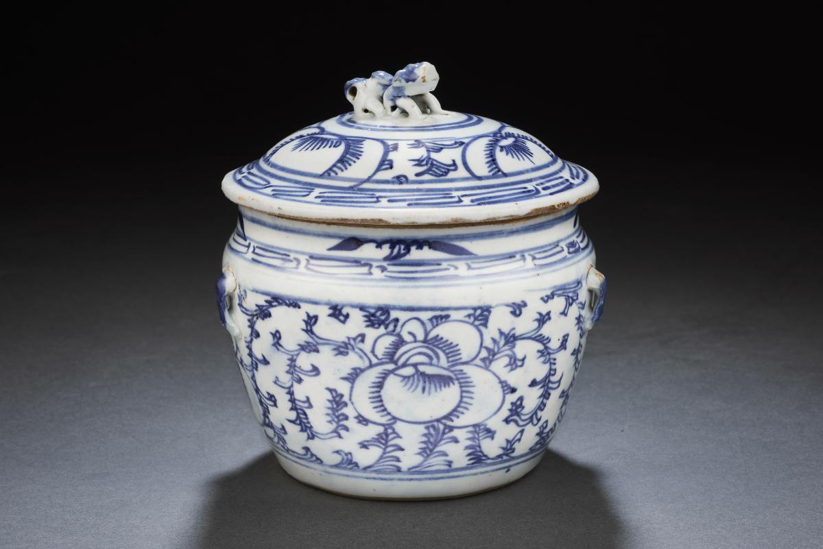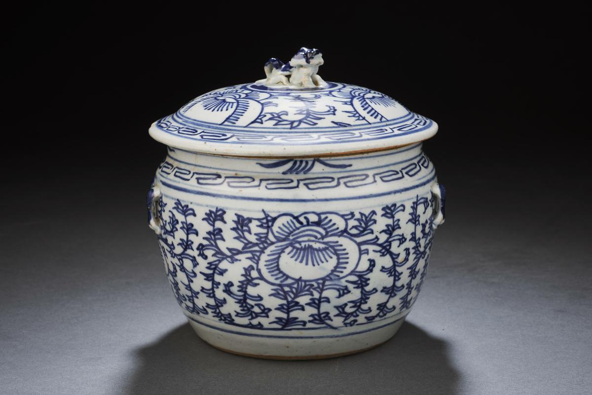 This blue and white covered jar ('kamcheng') has a domed cover featuring a finial in the form of a crouching Buddhist lion. The lid and body are decorated with sweet pea blossoms on a ground of sweet pea foliage, while the lip of the lid and shoulder of the body feature a key fret border. Two pairs of moulded perforated ears bearing the character 'wang' (king) sit below the shoulder and would have supported the kamcheng's two ring handles. This kamcheng belonged to Mdm Tan Quee Kee (1913-1992) who was born in Singapore into a Peranakan family. Her mother gifted her a set of three blue and white kamchengs before her marriage, and she brought them with her to her marital home when she married Mr Ong Bock Kim. They were used for ancestral worship purposes as well as in the kitchen to store condiments such as salt.