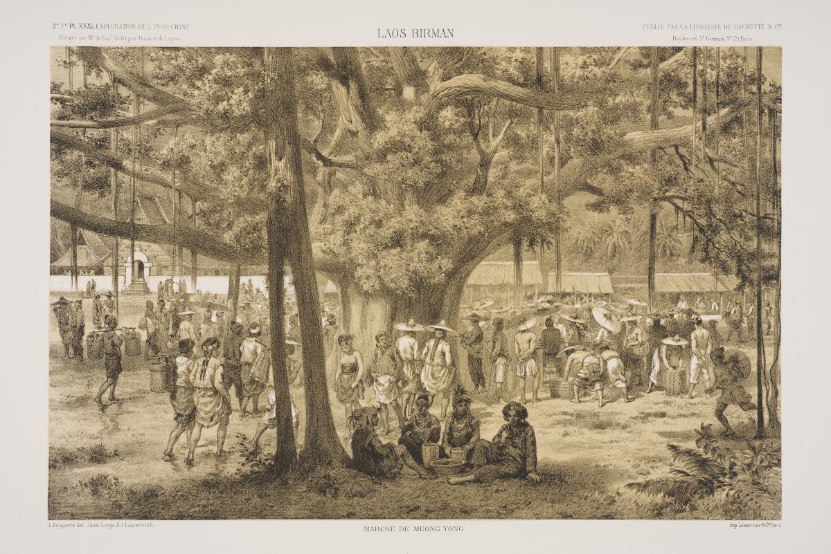 These lithographs were made after the drawings of Louis Delaporte (1842-1925), a young naval officer and skilled draftsman who accompanied the 1866-1868 Mekong Exploration Commission. The exploration of the Mekong was one of the most significant expeditions in Southeast Asia in the nineteenth century, taking two years to complete and covering territory of what is now Vietnam, Cambodia, Laos and south China. The principle goal of the expedition was to discover whether the Mekong could be a river trade route to China from the newly-established French territories in south Vietnam. The explorers also documented the landscape, local peoples and cultures, and flora and fauna.While the subject matter of Delaporte's illustrations indicates the scientific aspirations of the expedition, the images actually emphasise picturesque and exotic elements, which created the popular appeal for the published accounts of the expedition. The inclusion of "pictures of types," such as in this image, is an example. The artist’s style is generally highly detailed, in keeping with his official role of visually documenting the expedition, establishing the verisimilitude of the imagery. These images demonstrate the intimate connections between exploration, colonialism, representation and the pursuit of knowledge.