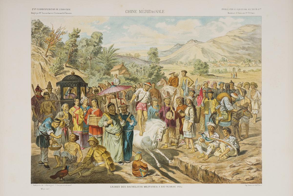 These lithographs were made after the drawings of Louis Delaporte (1842-1925), a young naval officer and skilled draftsman who accompanied the 1866-1868 Mekong Exploration Commission. The exploration of the Mekong was one of the most significant expeditions in Southeast Asia in the nineteenth century, taking two years to complete and covering territory of what is now Vietnam, Cambodia, Laos and south China. The principle goal of the expedition was to discover whether the Mekong could be a river trade route to China from the newly-established French territories in south Vietnam. The explorers also documented the landscape, local peoples and cultures, and flora and fauna.While the subject matter of Delaporte's illustrations indicates the scientific aspirations of the expedition, the images actually emphasise picturesque and exotic elements, which created the popular appeal for the published accounts of the expedition. These images demonstrate the intimate connections between exploration, colonialism, representation and the pursuit of knowledge.