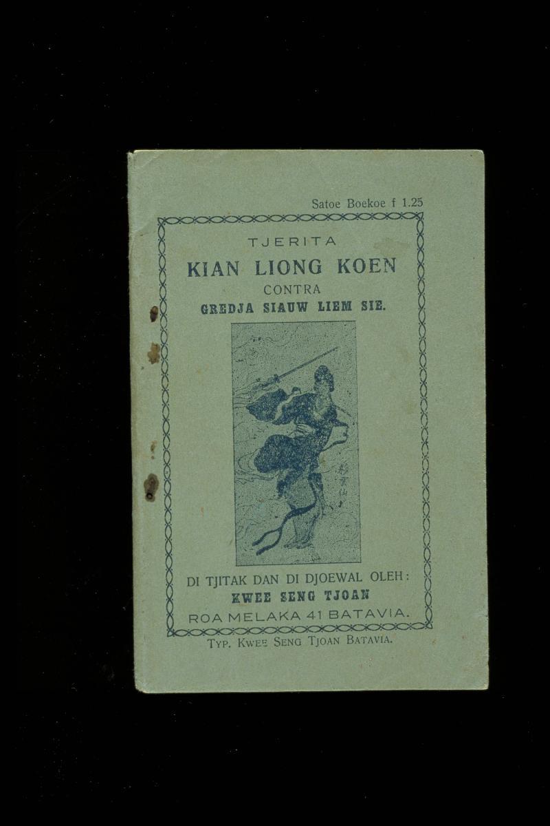 This is a complete, unillustrated series in 13 parts of the story, 大明正德 皇游江南传 (dà míng zhèng dé huáng yóu jiāng nán zhuàn) by Qing period author, He Mengmei (何梦梅) translated into 'low Malay' ("bahasa Melajoe rendah"). The story tells of how Ming Emperor Zhengde travelled incognito in southern China, particularly Suzhou, and discovered the true state of corruption and sedition among his advisers. This series was published by Kantoor Tjitak Lie Tek Long (Lie Tek Long Printing Office) located at Pintoe Besar Batavia, a historic street also known as Nieuwpoort Straat by the Dutch in the heart of Kota Tua, the historic quarter of today’s Jakarta. The books also bear the stamp of the seller, “Boekhandel & Drukkerij Tan Thian Soe” or Tan Thian Soe Bookstore & Printing Company, also located in Batavia. The translator, Liem Liep Lee, was from Tegal, one of the larger cities along the north coast of Java, underscoring the presence and settlement of Chinese Peranakan communities outside of Batavia/Jakarta.