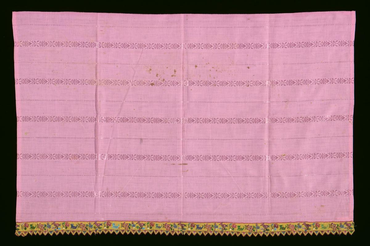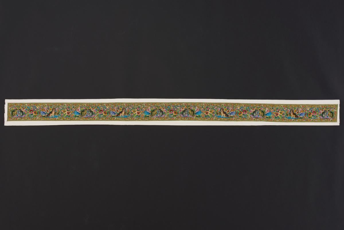 This long panel would have been attached to the side of the mattress on a Chinese Peranakan wedding bed. It was part of a wide array of embroidered textiles used to decorate the bed. The mattress panel reveals multiple cultural influences. Pairs of roosters and hens alternate with clutches of roses in a sequence set against a turquoise ground, a popular shade in nyonya needlework from Penang. Roses were popular because of their resemblance to peonies, a traditional Chinese symbol of wealth, honour, and love.