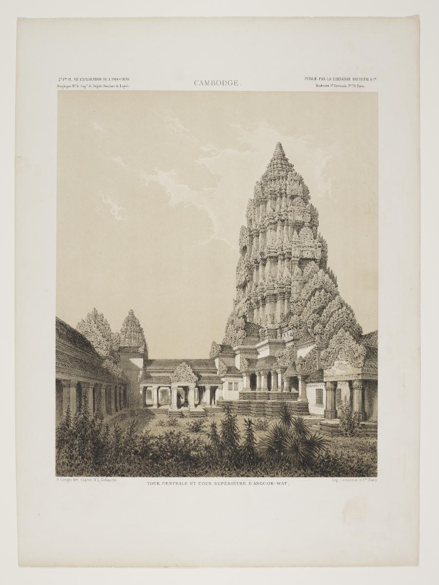 These lithographs were made after the drawings of Louis Delaporte (1842-1925), a young naval officer and skilled draftsman who accompanied the 1866-1868 Mekong Exploration Commission. The exploration of the Mekong was one of the most significant expeditions in Southeast Asia in the nineteenth century, taking two years to complete and covering territory of what is now Vietnam, Cambodia, Laos and south China. The principle goal of the expedition was to discover whether the Mekong could be a river trade route to China from the newly-established French territories in south Vietnam. The explorers also documented the landscape, local peoples and cultures, and flora and fauna. While the subject matter of Delaporte's illustrations indicates the scientific aspirations of the expedition, the images actually emphasise picturesque and exotic elements, which created the popular appeal for the published accounts of the expedition. These images demonstrate the intimate connections between exploration, colonialism, representation and the pursuit of knowledge.Delaporte's images were also significant for their representation of the monuments of Angkor, which were not yet well known in Europe. Delaporte became passionately interested in Khmer architecture: in 1873, he returned to Cambodia and made further drawings of Angkor Wat, later publishing his own book on the subject. He collected Khmer objects and made plaster casts of sections of the monuments, which were exhibited in Paris. In 1882 he founded a museum of Khmer and Cham art in Paris: its collection later formed part of the Musée Guimet, Paris.This print comprises multiple images, including a sweeping panoramic view of the monument of Angkor Wat and its external causeway. In keeping with the fashionable conventions of picturesque imagery of the time, the view of the monument is framed in the foreground by trees and vines, suggesting the encroachment of the forest.