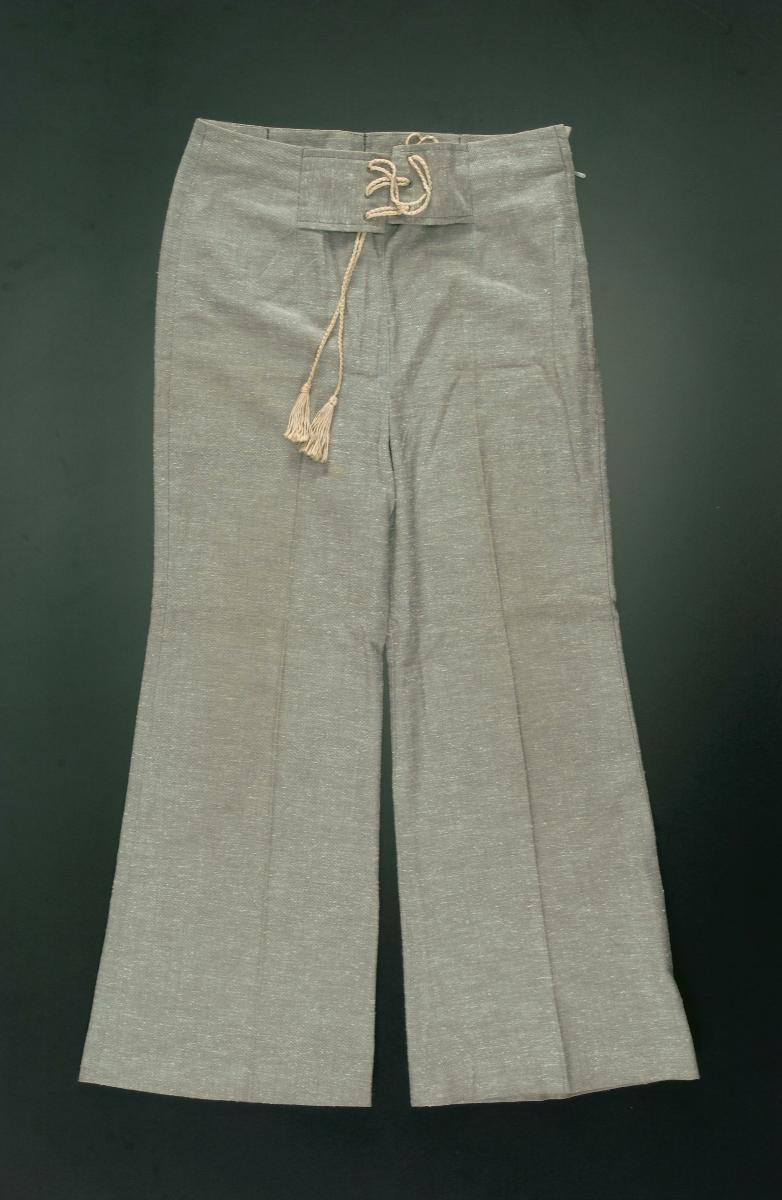 This outfit is part of a group of objects donated by Mr Wilson David. The striking ensemble of shirt, bellbottom pants and belt with tassels were worn by David for his stage performances.A local singer-performer who paid tribute to Elvis Presley, David has been likened to the Rock and Roll King. David took to dressing in costumes modeled after Presley’s. With long sideburns and crooning style, and dressed in tailored pantsuits, broad belts, and shoes, he performed to full houses in Singapore. Especially in the 1960s, he was the opening act for several international artists (Helen Shapiro, Freddie and the Dreamers, Honeycombs) and thus contributed to the local popular music scene. However, David’s pantsuits are unlike that of Presley’s costume, which were basically jumpsuits. Still David’s adoption of the Presley costume is significant as it shows how Presley’s sartorial appearance was received in Singapore. Presley’s single-piece costumes were specifically designed to accommodate his robust signature movements on stage. The star wore the first jumpsuit on January 14, 1973 for the TV special program, Elvis Aloha from Hawaii. Designed by Bill Belew, this famous costume was called Aloha.