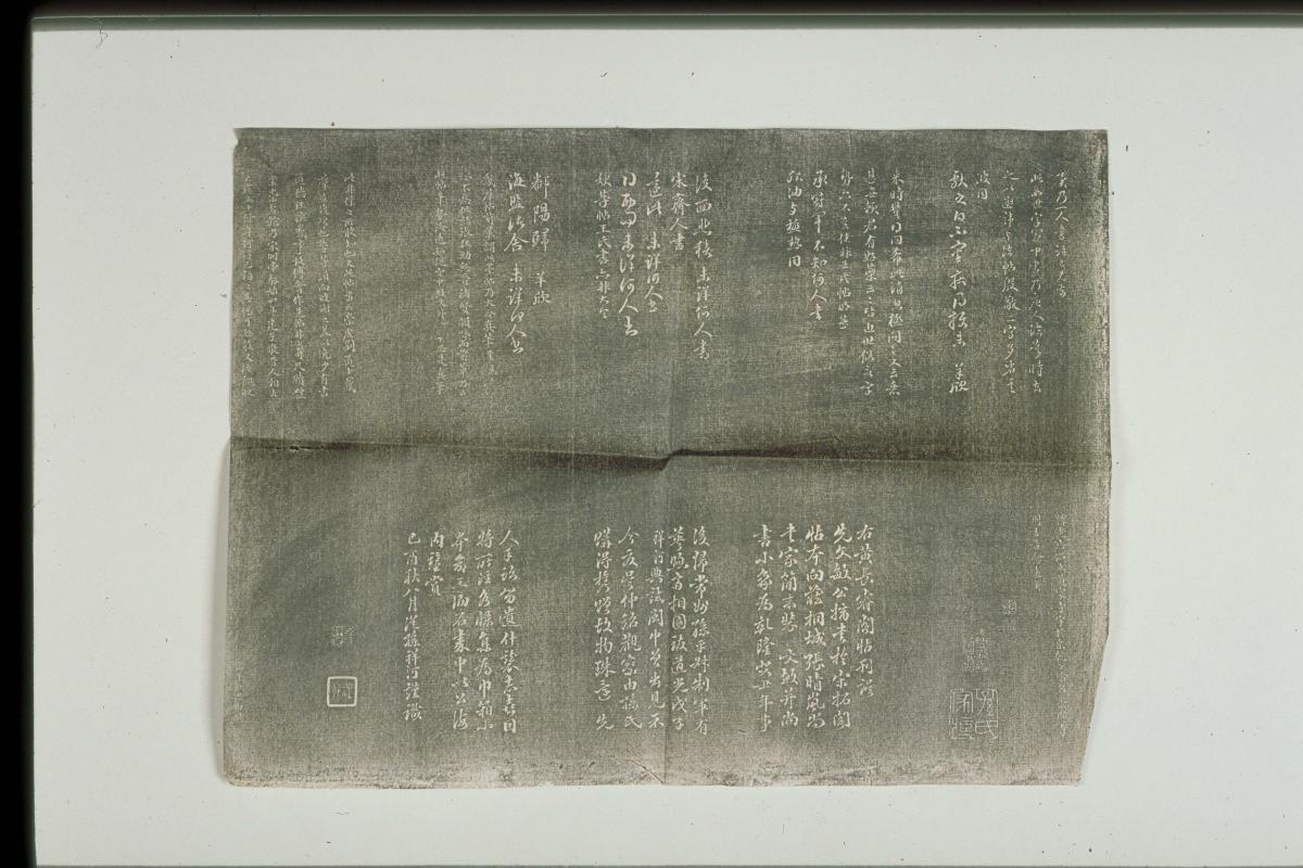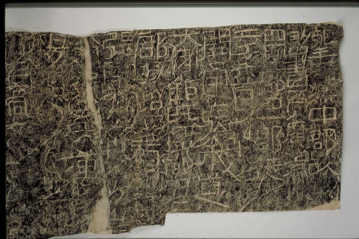 This is a hanging scroll showing an ink rubbing of an inscribed iron qin by Wu Ruolang (active 19th century). The rubbing is inscribed with a long colo-phon by Huimao Jushi (1887–1967) in the year of Gengyin (corresponding to 1950), along with two inscriber’s seals, and nine collectors’ seals in red ink. Ink rubbings were made to document important works of art or, like here, calligraphic engraving on objects. Many preserve commemorations of im-portant social or political events. Rubbings can be made from many differ-ent materials and objects, including engraved bronze vessels, ancient mir-rors, jades, grave markers, lacquer wares, and ink stones. For many centu-ries, scholars and collectors have enjoyed acquiring ink rubbings, especially those with significant historical value, and circulating them among like-minded friends.