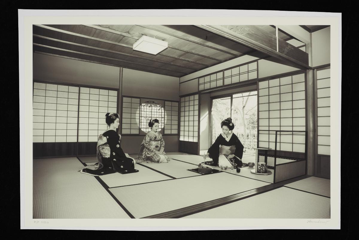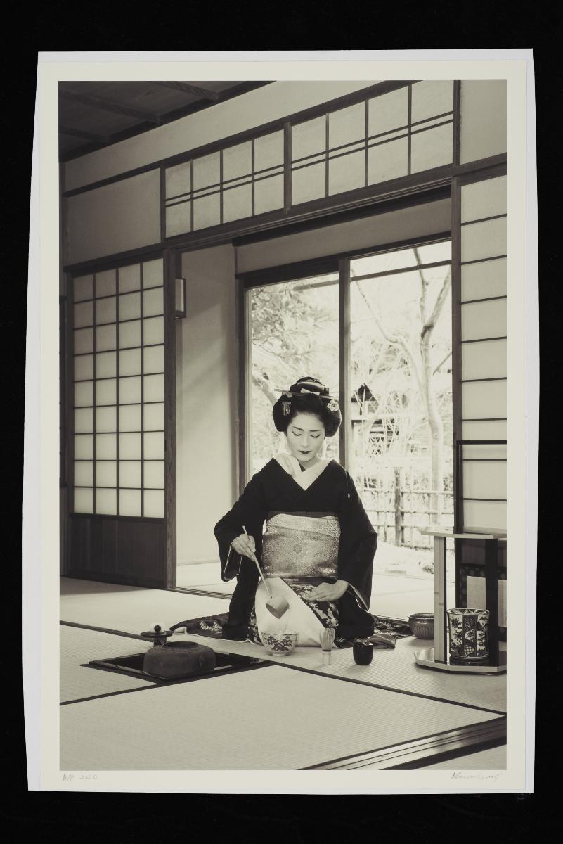 Geiko Fukune with her tea bowl from the Waraku KlinNashinoki Shrine, Kyoto, 2020Archival pigment print on photo ragGeiko Fukune is holding a tea bowl with Japanese maple leaf (momiji) design. It was made by Kawasaki Waraku, 7th-generation grandmaster of the Waraku kiln. Waraku kiln has been producing raku wares in Kyoto since the late Edo period. The term raku comes from the site where clay was dug from in Kyoto in the late 16th century. It uses a similar Kanji character 楽 to the one that means "enjoyment". Raku ware marked an important point in the historical development of Japanese ceramics. It was the first type to use a seal mark and the first to focus on close collaboration between potter and patron.