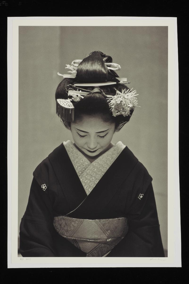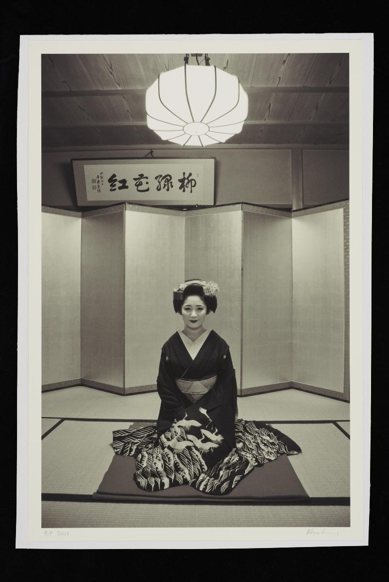 Maiko Sayaka performing her dance during the Erikae ceremonyKyoto, 2011Archival pigment print on photo ragA maiko performs a dance called kuro-kami (literally, black hair) in front of clients before her Erikae ("turning of the collar") ceremony. This dance and the ceremony mark the point at which a maiko becomes a geiko. The Erikae ceremony often happens over the course of two weeks, as a maiko gradually prepares herself to become a geiko. During that time, she changes her hairstyle, blackens her teeth, receives her geiko name, then changes her collar (eri) from red to white.