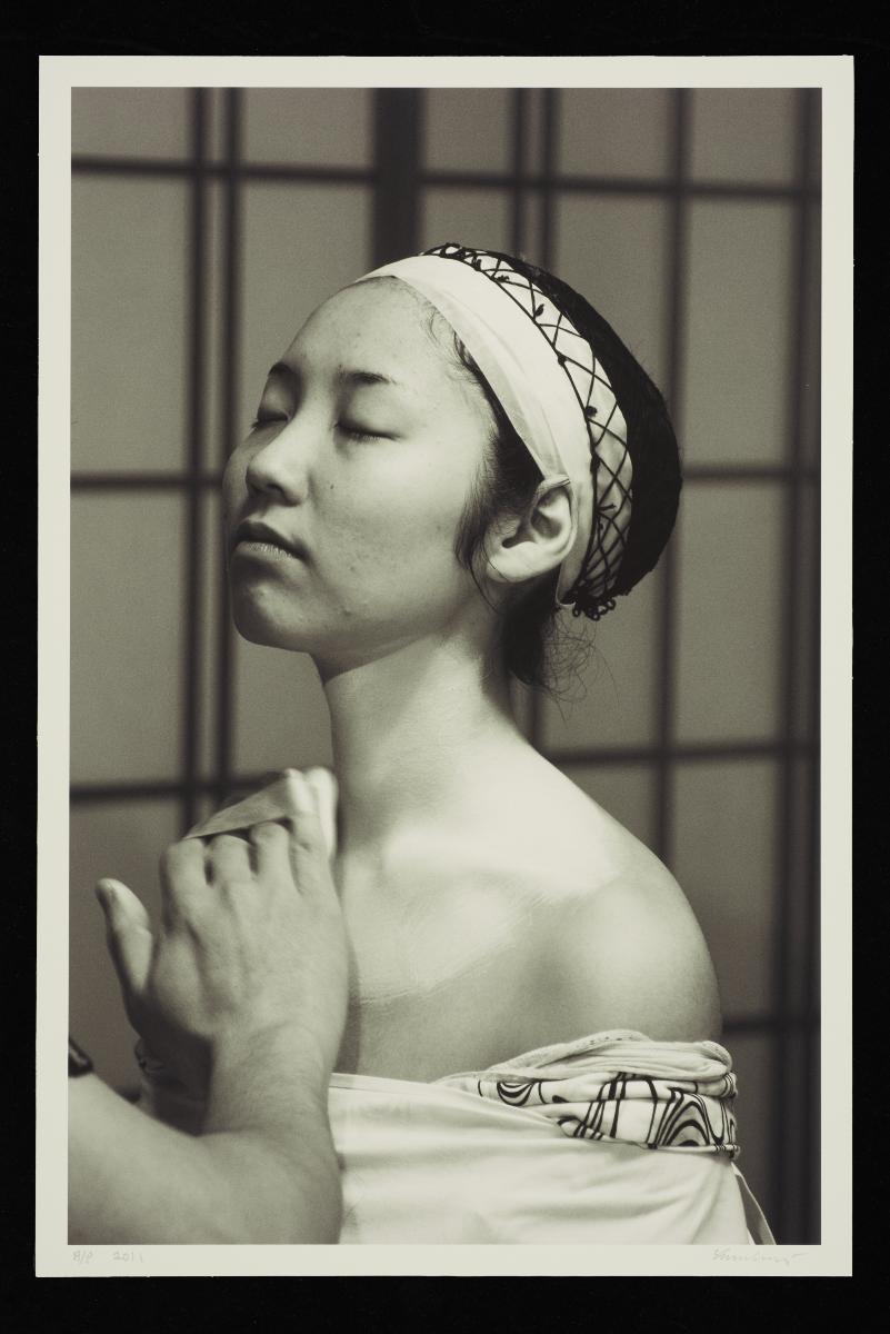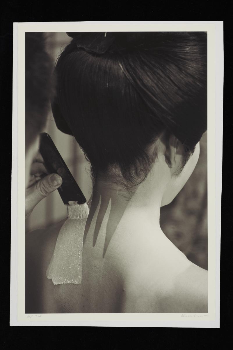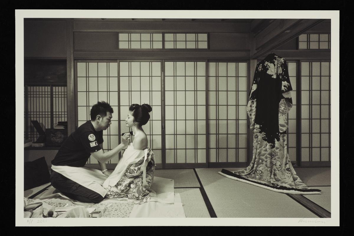 Geiko and maiko having makeup appliedHigashiyama ward, Kyoto, 2011Archival pigment print on photo ragGeiko Sayaka and Maiko Satsuki are having their makeup applied in the Tsurui Ochaya in Gion Kobu kagai. The hour-long process ends with the donning of the Kimono.