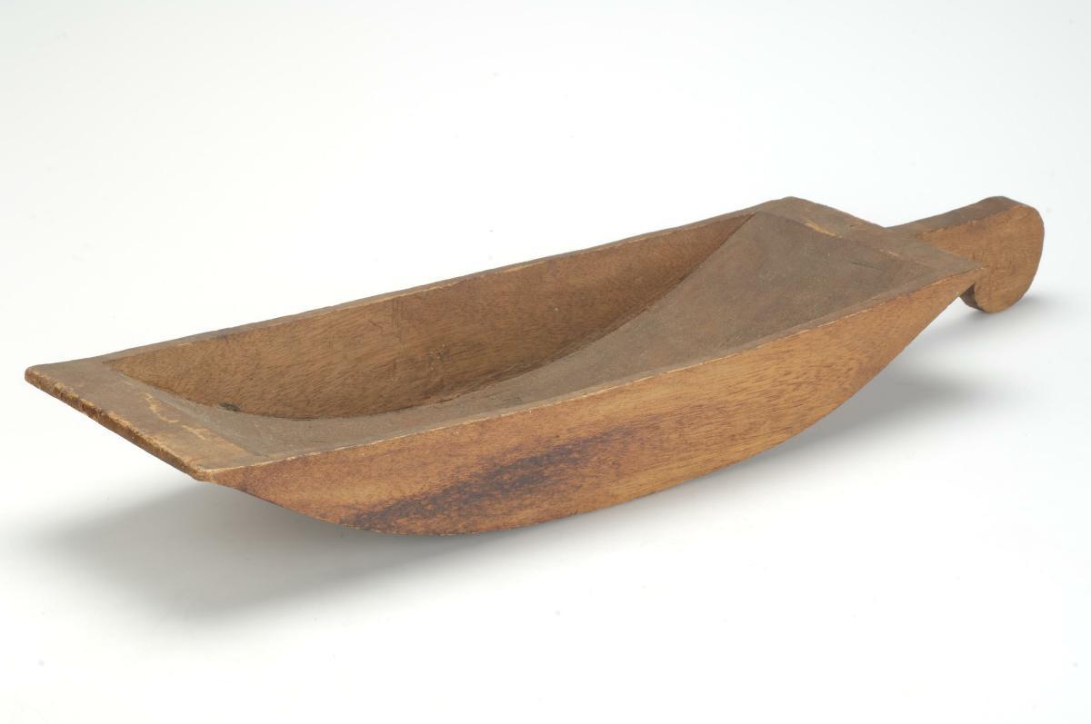 This is part of a set of Parsi Zoroastrian ritual paraphernalia (alat) consisting of implements that are used for Zoroastrian fire rituals. Fire (atash), which is associated with truth and societal order, is a medium through which Zoroastrians offer prayers to Ahura Mazda. This khumcho or ses (ritual tray) is used to hold religious implements and offerings used for the ritual, and is said to be representative of the Amesha Spenta, which are divine entities emanating from Ahura Mazda. Formerly belonging to Parsi Zoroastrian priest, this set of ritual paraphernalia is likely to have been made for personal use, as noted from the small stature of the afarganyu.Despite being relatively small in numbers since their settling in India in the 10th century, members of the Parsi community have become influential figures in the areas of trade, commerce, and industry in India by the mid-19th century. In addition to being involved in a host of charitable works such as the building of fire temples, schools, and hospitals, the Parsi community, with their new-found wealth and trade networks, were also engaged in a wider range of consumerism that included the use of silverware. Gaining in popularity in India during the 19th century, silverware was produced for both the local and European market in several centres within India, such as Madras, Kutch, Kashmir, Calcutta, and Bombay. Silver workshops in European centres in Germany and Britain were also commissioned to produce silverware for export to India, of which the German-made afarganyu is a fine example. Locally produced at a fraction of the cost of imported silverware, nickel silverware, such as this ses, came to be more popular than pure silver ware.