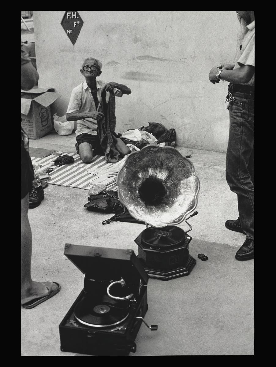 This photograph shows a back-alley flea market seller with his goods consisting of antiquities and collectibles. Such trades are now increasingly rare and this photograph serves almost as a form of documentation for a time in Singapore's history where such trades were more commonly found.