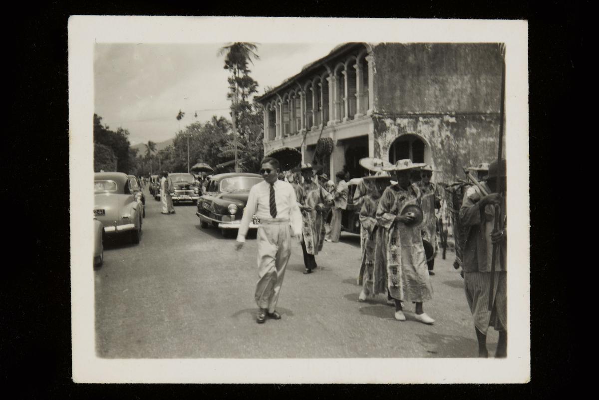 This photograph shows a Chinese Peranakan wedding procession headed by a car.This photograph is part of a series of 74 photographs documenting a Peranakan wedding held in Penang in 1951. Peranakans commissioned photographs to document their families and important life events such as marriages and deaths. They also commissioned photographs to record their involvement in business enterprises, and in social causes such as schools and academic societies, religious groups, and in community and cultural associations. With improvements in camera technology, it became possible to take photographs without the assistance of a studio in the first decades of the 20th century.
