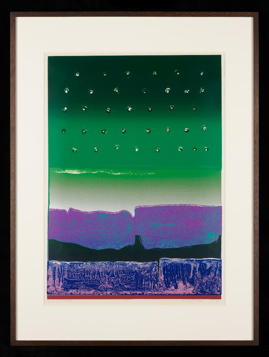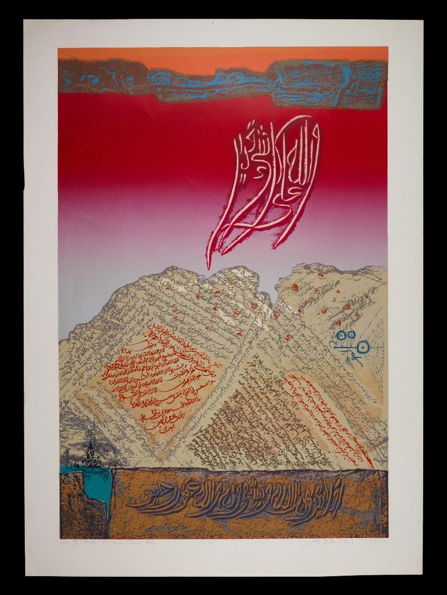 "Doa IX/Tawakal" shows a monolithic structure that seems to resemble a tombstone inscribed with lines of beautifully written calligraphic writing. The work represents a more mature period of A.D. Pirous's experimentation with silkscreen printing that he started in 1975. Pirous was inspired by the visuality of Acehnese Islamic tombstone or Batu Aceh on which he inscribed legible calligraphic writing drawn from Qur'anic verses. A.D. Pirous (b. 1931, Meulaboh, Indonesia) is an Indonesian painter and printmaker whose works contribute significantly in the development of modernist and calligraphic abstraction in Indonesia and Southeast Asia. He is known for his calligraphy that largely draws from Qur'anic verses, Islamic manuscripts, and tombstones. His artistic practice and ideas of modern and Islamic art contribute significantly to the shaping of its canon and art historical narrative.