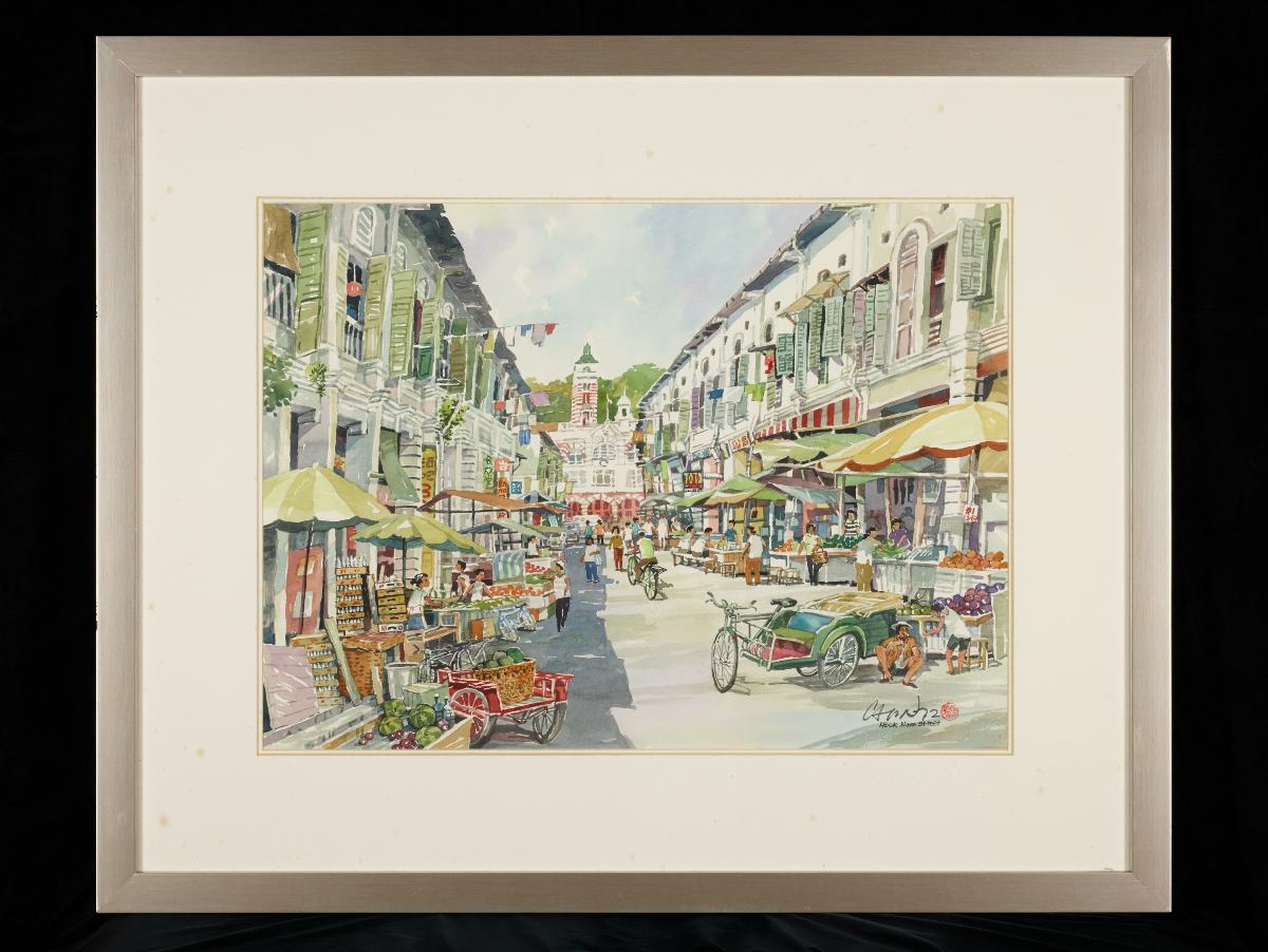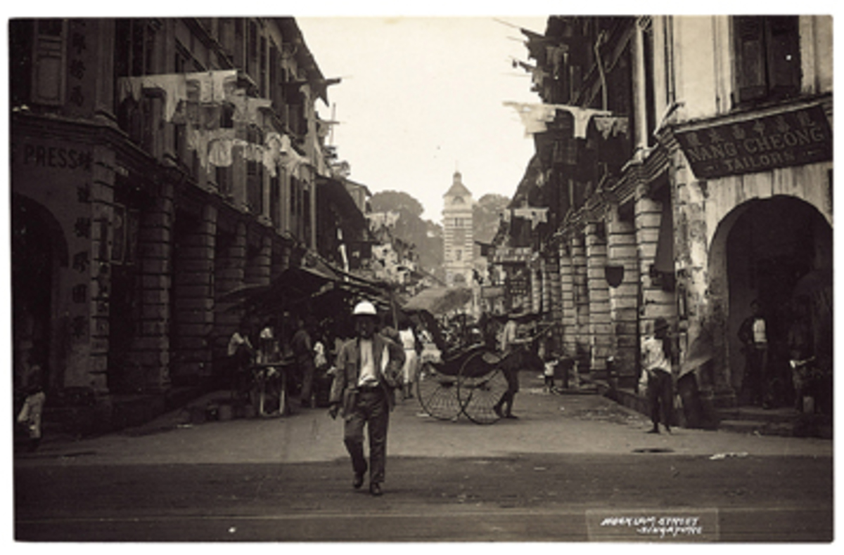This Eastman Color transparency shows a street scene at Hock Lam Street, Singapore. Street hawkers line the street along rows of shophouses on either side. An accompanying leaflet in the box of colour transparencies in which this one was kept describes this photograph as “Street scene, Hock Lam Street Singapore”.Eastman Color was a range of films developed by the Eastman Kodak Company in the 1950s.