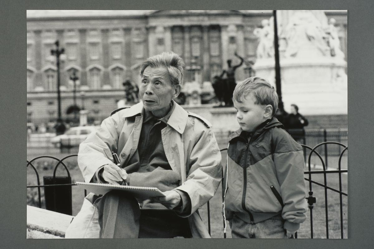 Curious children watch as Wu Guanzhong sketches outdoors, sheltered by his son Wu Keyu. 好奇的孩子在观看吴冠中写生,他的儿子吴可雨在帮其撑伞。