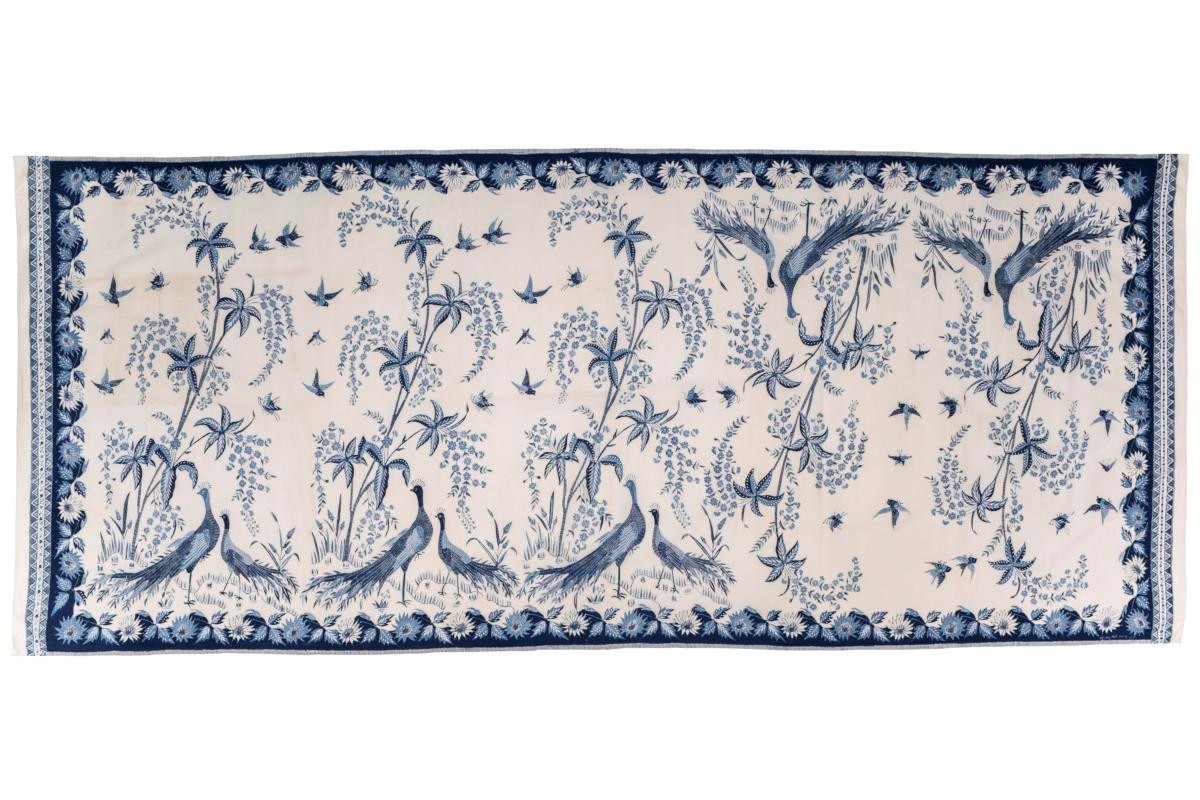 This batik textile is by contemporary Indonesian batik artist, Bayu Aria Widhi Kristanto, from his Hokontul (Hokokai batik made in Bantul) series, which are inspired by Hokokai batik created during the Japanese occupation. This piece merges the pesisiran style of naturalistic motifs—such as flowers, butterflies, and the luk cuan (lokcan), a bird motif derived from the Chinese mythical phoenix—with the traditional central Javanese batik colour of sogan brown. The Chinese phoenix is often viewed as an emblem of beauty and associated with good luck, and thought to appear in peaceful and prosperous times, making it a popular motif. This piece also has a pagi-sore badan. Pagi-sore (or “day-night”) batik consists of two distinct designs and colours on a diagonally bisected badan. This allows the wearer to achieve two different looks in the day and at night by arranging the same cloth differently.