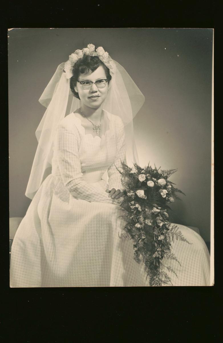 This bridal outfit was worn by Sharifah Rugayah Aljunied for her wedding in 1964, and reflects Malay world influence on Arab Peranakan dress. The outfit is a Malay baju kurung, which comprises a long-sleeved tunic and a long, ankle-length skirt. The style is reflective of what was in vogue during the 1960s, a more closely-fitted style similar to the kebaya Kota Bharu style. Along with the ensemble is a delicate embroidered selendang (shoulder cloth or shawl that can also be used a veil or head covering). The main embroidery design on the tunic and skirt consist of floral motifs as stalks and sprays of flowers. The exquisite "tekat timbul" or traditional Malay couched embroidery, was executed by one of the family's matriarchs, Sharifah Noor Aljunied. The embroidery on the selendang is of a different form known as "kelingkan" or "keringkam" in Malay where the metallic filaments used are typically flat ribbons.