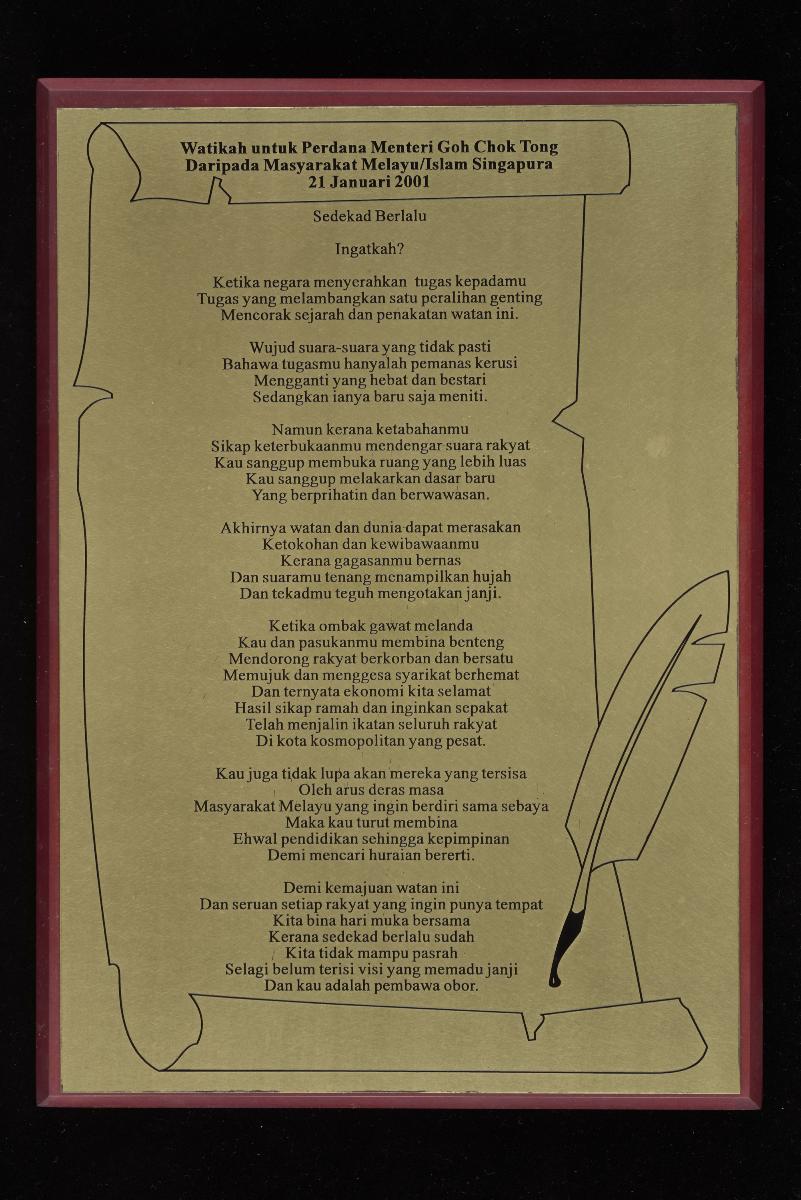 Plaque given to Mr Goh Chok Tong by National Convention of Singapore Malay/ Muslim Professionals