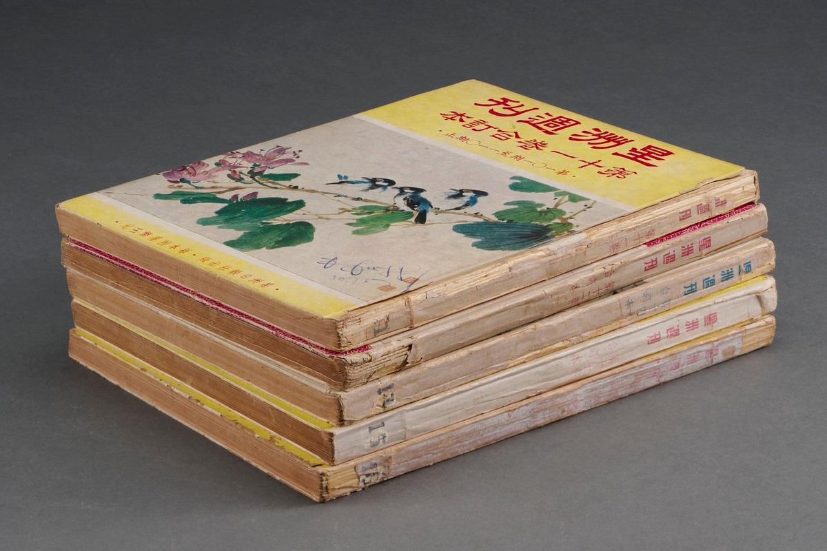 Five bound volumes of Sin Chew Weekly magazines (星洲周刊), volumes 11–12 (issues 101–120) and volumes 14–16 (131–160)