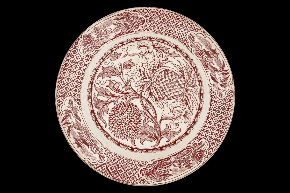 The expansion of European colonial territories in the 19th century also translated into potential new markets for industries and businesses to tap into. One such industry was that of ceramic ware, particularly that of dining ware. Pottery makers in Europe thus began to produce export ware using stylistic influences and elements deemed appealing to potential consumers in the colonies.Specific to Southeast Asia, these firms began to produce rice plates which were better suited for the region's cuisine which mainly consisted of rice and accompanying dishes. Compared to conventional dinner plates, these rice plates have greater concave depth, which meant they are better able to contain rice and dishes within them. These firms also began to incorporate motifs seen as "local" to the region, drawn from popular floral patterns and fruit depictions as depicted through natural history prints and photographs. One of the most widely sought after and available European transferware in Southeast Asia was those produced by the Glasgow-based Scottish firm, J. & M. P. Bell and Co. Established in 1841 by the Bell Brothers, John and Matthew Perston, initially focused on kitchenware. By the 1860s, they became well-established, with increasing demand for their decorative but practical wares. By 1880s the firm shifted to squarely target the export market as their appeal in the home market declined. While transferwares with two-colour and three-colour printing had little appeal in the United Kingdom, it proved to be extremely popular in the Asian market. Five colours were used by Bells, either individually or in combination with each other: red, blue, green, brown and yellow. Their export wares are often identifiable on the back of the ware, where the title of the pattern (often in romanized Malay) would be printed together with the Bells logo.This plate bears the "Buah Nanas" (Pineapple) pattern, in a dual-toned variation of red and green. The "Buah nanas" pattern features a central pattern of three pineapples, encased in a crescent moon with batik-inspired floral and butterfly motif.
