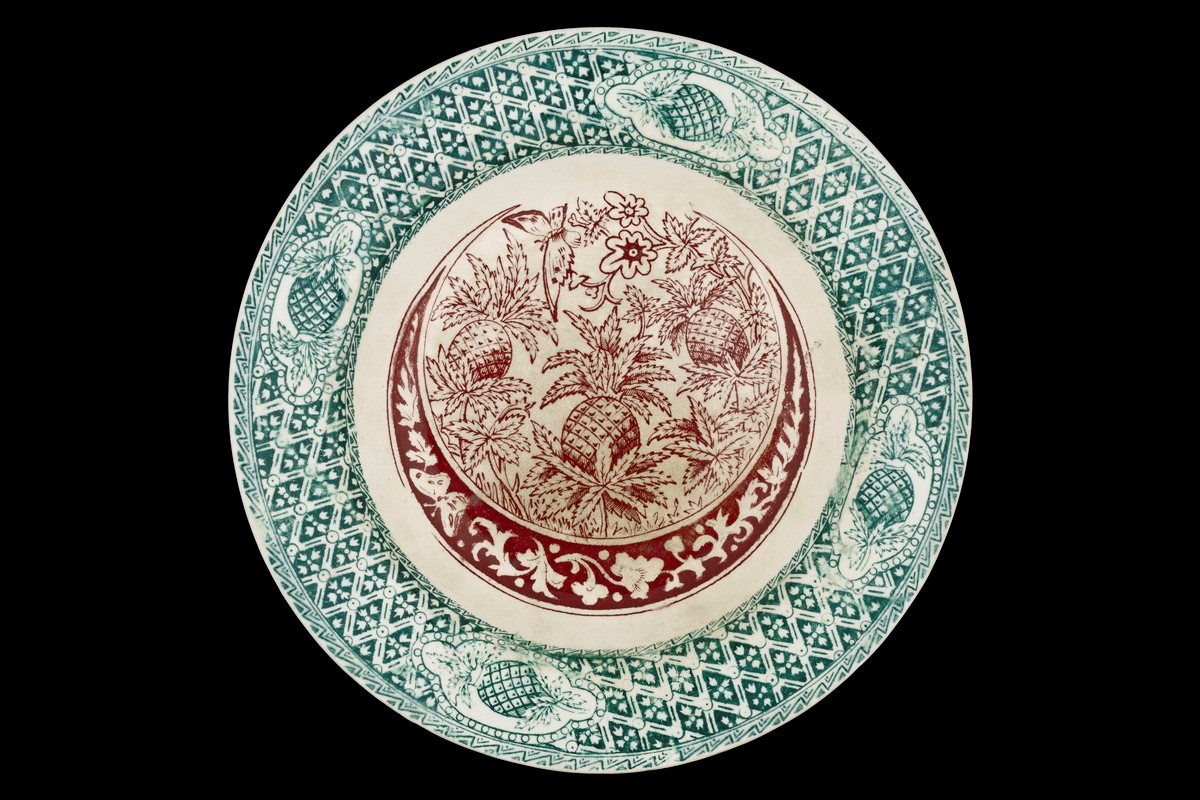 The expansion of European colonial territories in the 19th century also translated into potential new markets for industries and businesses to tap into. One such industry was that of ceramic ware, particularly that of dining ware. Pottery makers in Europe thus began to produce export ware using stylistic influences and elements deemed appealing to potential consumers in the colonies.Specific to Southeast Asia, these firms began to produce rice plates which were better suited for the region's cuisine which mainly consisted of rice and accompanying dishes. Compared to conventional dinner plates, these rice plates have greater concave depth, which meant they are better able to contain rice and dishes within them. These firms also began to incorporate motifs seen as "local" to the region, drawn from popular floral patterns and fruit depictions as depicted through natural history prints and photographs. One of the most widely sought after and available European transferware in Southeast Asia was those produced by the Glasgow-based Scottish firm, J. & M. P. Bell and Co. Established in 1841 by the Bell Brothers, John and Matthew Perston, initially focused on kitchenware. By the 1860s, they became well-established, with increasing demand for their decorative but practical wares. By 1880s the firm shifted to squarely target the export market as their appeal in the home market declined. While transferwares with two-colour and three-colour printing had little appeal in the United Kingdom, it proved to be extremely popular in the Asian market. Five colours were used by Bells, either individually or in combination with each other: red, blue, green, brown and yellow. Their export wares are often identifiable on the back of the ware, where the title of the pattern (often in romanized Malay) would be printed together with the Bells logo.This plate bears the "Burung and Kupu" (Bird and Butterfly) pattern, in a single-tone variation of blue. The "Burung Kupu" pattern is a composite pattern of a stylized swiftlet and butterflies. In contrast, the rim design of the plate is likely based on existing floral and vase floral motifs already used by J. & M.P. Bell & Co. for their Europe-focused wares, such as the Porringer pattern.