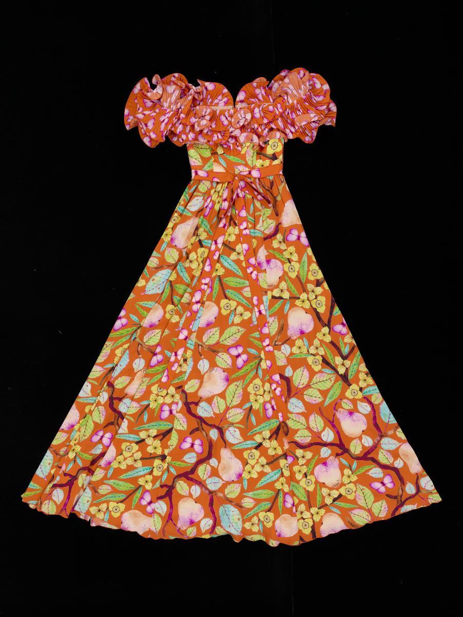 This long sleeve crepe gown features appliqué of black guipure lace forming butterfly, olive, and floral motifs. The laces are vintage deadstock from the 1960s that Andrew Gn procured at an auction. It reflects his attention to exquisite craftsmanship through a simple silhouette but intricate techniques. Andrew Gn is one of Singapore’s most prolific fashion designers in history, achieving high levels of critical acclaim and industry success. He is the only Singaporean to be a constant feature of Paris Fashion Week since 1995. His creations are known for their elegant, feminine, maximalist aesthetics and are finely crafted, cross-cultural, and reflective of innovation in tradition in fashion. This work is part of his major gift back to Singapore.