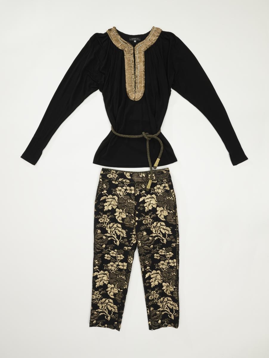 This ensemble is features prints of daffodils and narcissus against black silk as an ode to the Vienna Seccession. The blouse is decorated with lace appliqué and passementerie trim, and is finely tailored. Andrew Gn is one of Singapore’s most prolific fashion designers in history, achieving high levels of critical acclaim and industry success. He is the only Singaporean to be a constant feature of Paris Fashion Week since 1995. His creations are known for their elegant, feminine, maximalist aesthetics and are finely crafted, cross-cultural, and reflective of innovation in tradition in fashion. This work is part of his major gift back to Singapore.