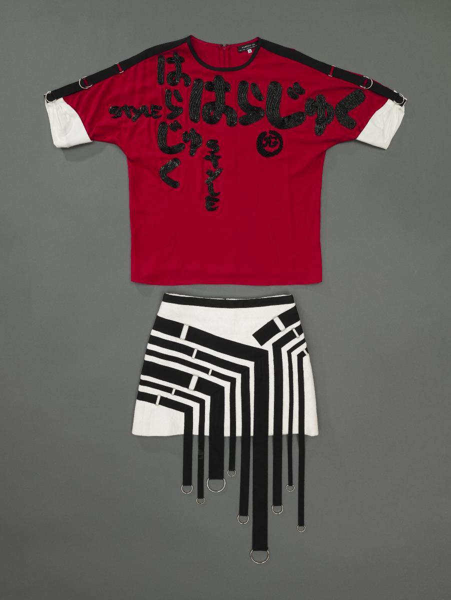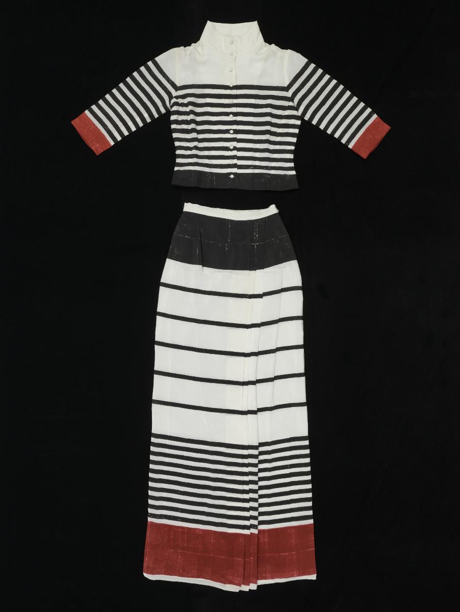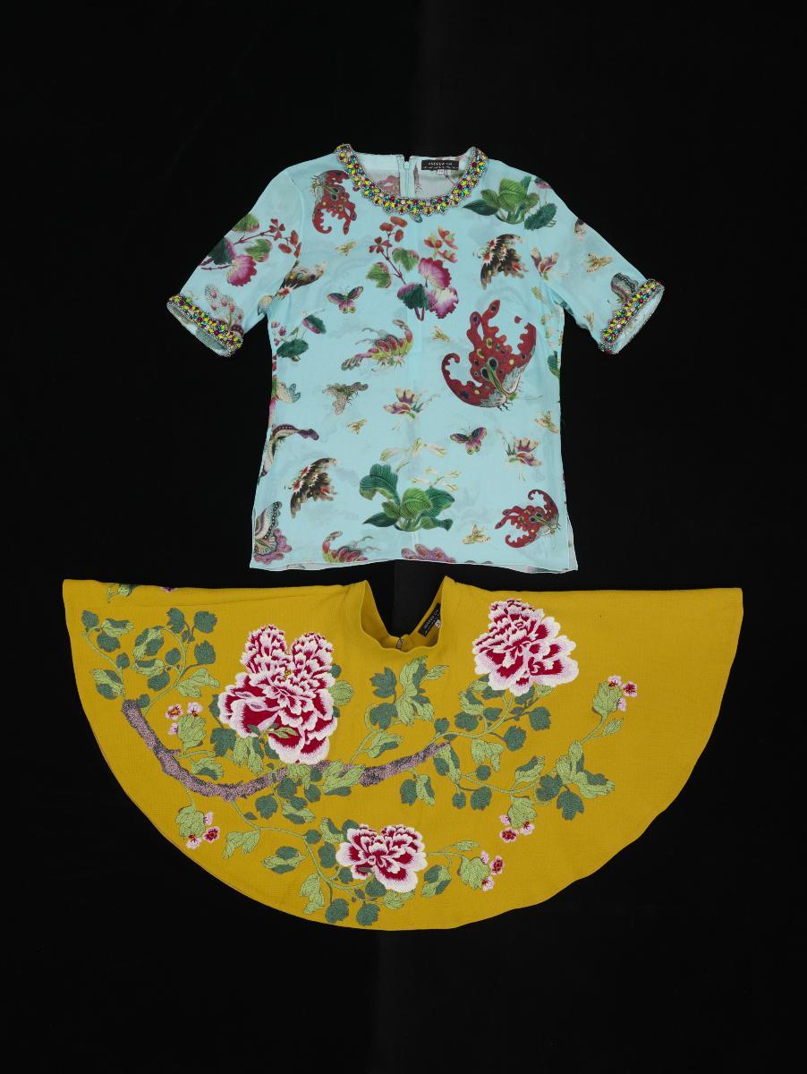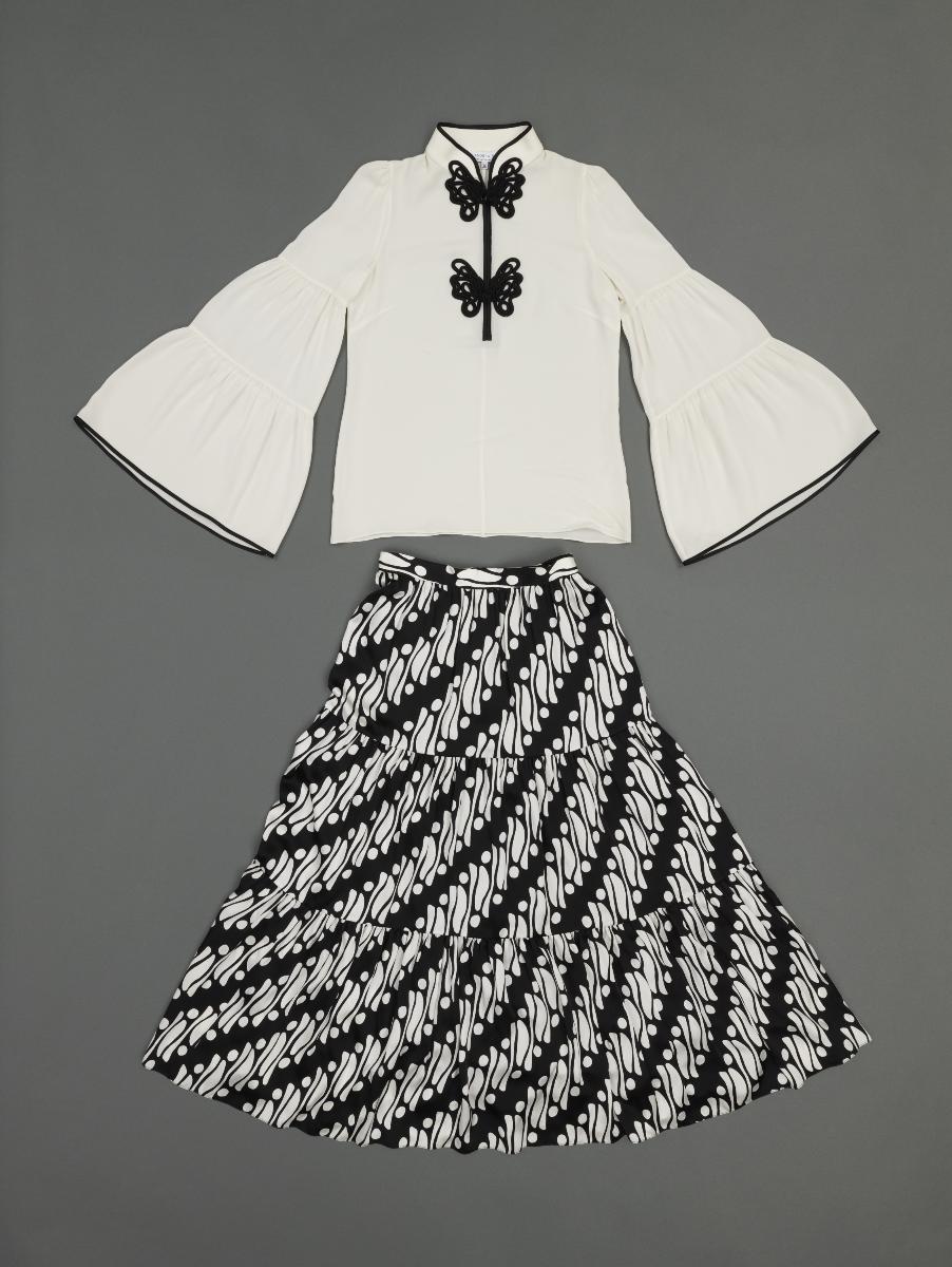 This blouse is printed with rose motifs and feature 3D floral appliqué at the cuffs and neckline while the skirt is fully embroidered in cabbage rose motifs. It comes from Andrew Gn’s Spring/Summer 2004 collection inspired by the 1967 film ‘Belle de Jour’, in which French actress Catherine Deneuve was dressed by the late Yves Saint Laurent. Andrew Gn is one of Singapore’s most prolific fashion designers in history, achieving high levels of critical acclaim and industry success. He is the only Singaporean to be a constant feature of Paris Fashion Week since 1995. His creations are known for their elegant, feminine, maximalist aesthetics and are finely crafted, cross-cultural, and reflective of innovation in tradition in fashion. This work is part of his major gift back to Singapore.