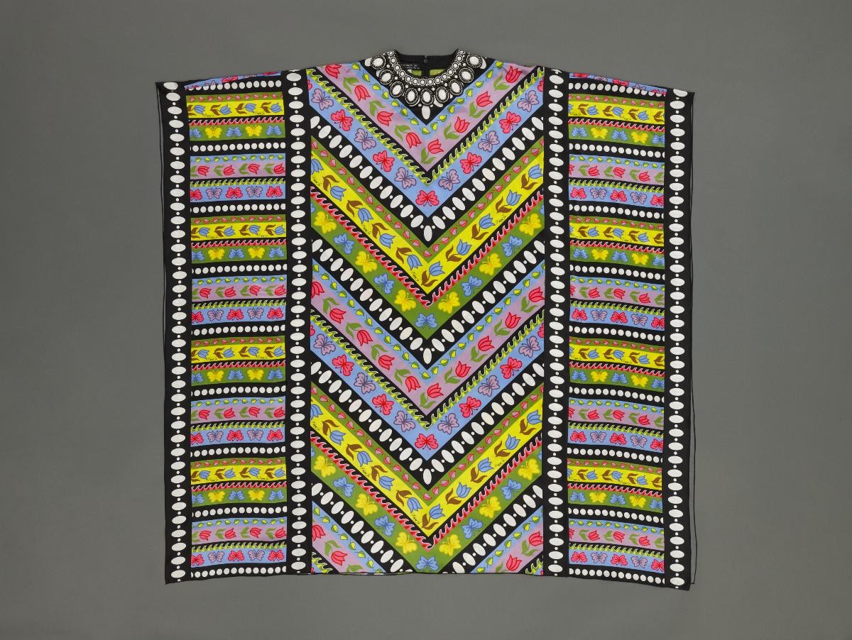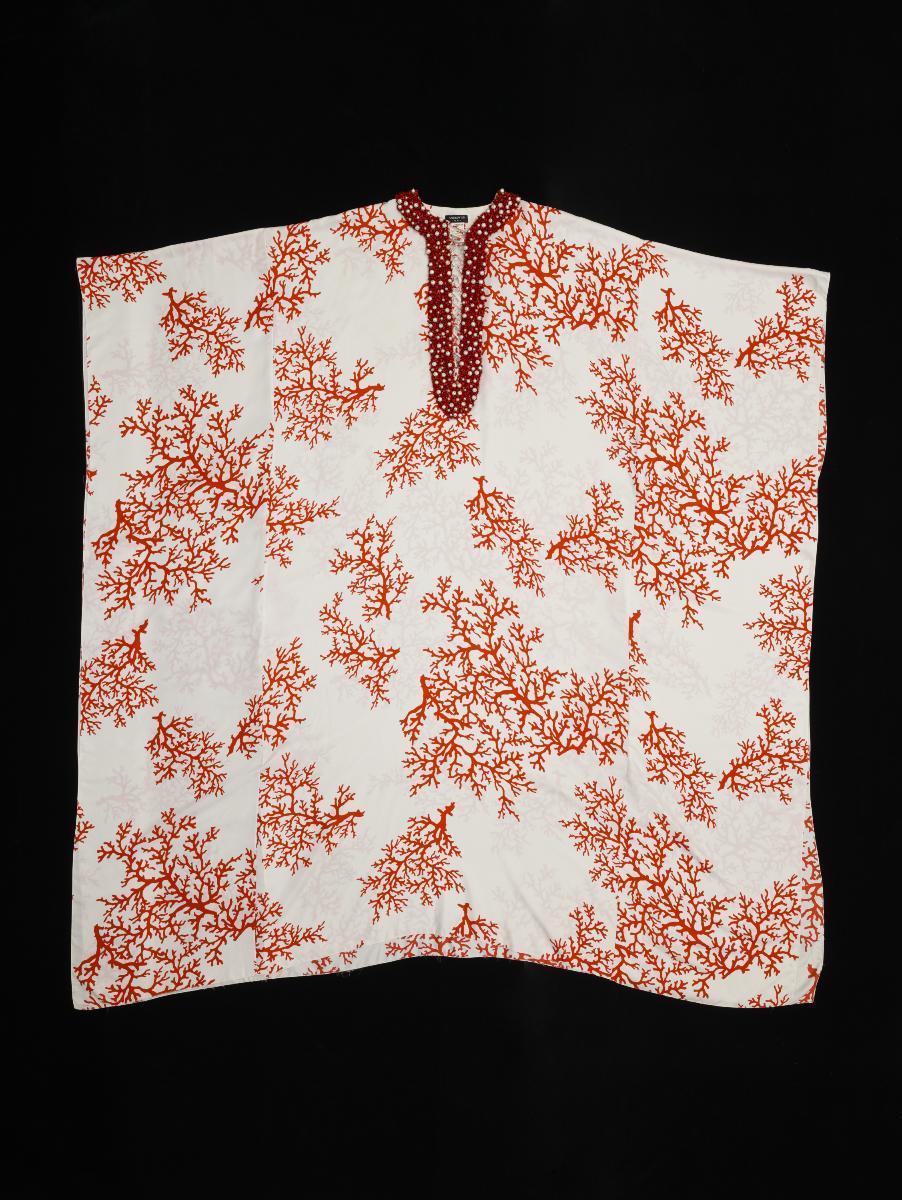 This white kaftan with oversized kimono sleeves is accented with a grosgrain ribbon belt. It features pleated details at the V-neck. Andrew Gn is one of Singapore’s most prolific fashion designers in history, achieving high levels of critical acclaim and industry success. He is the only Singaporean to be a constant feature of Paris Fashion Week since 1995. His creations are known for their elegant, feminine, maximalist aesthetics and are finely crafted, cross-cultural, and reflective of innovation in tradition in fashion. This work is part of his major gift back to Singapore.