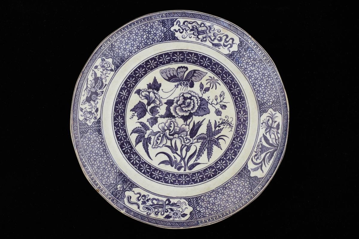 "Rice plate" is the name ceramics collectors use for large, shallow bowls like this, which became popular in Southeast Asia. They were well-suited to the region's cuisine. This plate made in England by Bell Pottery bears the "Johore" pattern, featuring an imagined view of the Malay state with an pagoda and Chinese junks in the foreground. This pattern was registered by Bell Pottery in 1887 (No. 83485).Transferware ceramics are decorated by a process in which a design is printed onto tissue paper, then transferred directly to the piece of pottery before firing, allowing for complicated designs to be produced quickly and without the need for skilled painters.