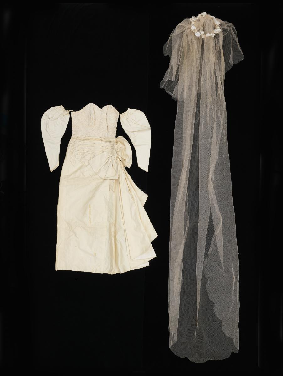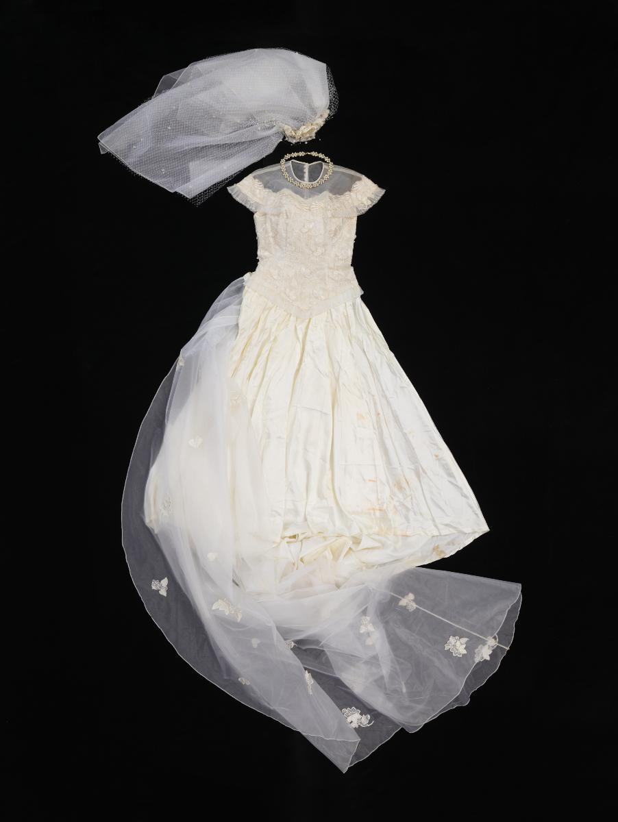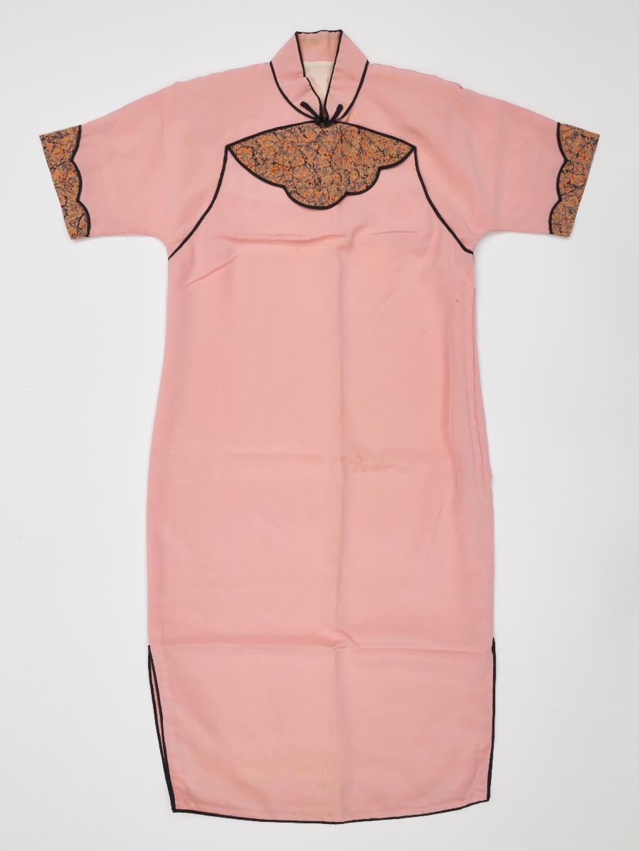 This dress was made by the Shanghainese dressmaker, Mr Cheong Foo Yong, for his daughter May. Cheong was born in 1933 in China and migrated to Singapore at the age of seven. When he was about sixteen, Cheong worked as an apprentice dressmaker and subsequently became a bespoke dressmaker. In 1960, he opened his shop ‘DANA Gowns Dressmaker’ at Maju Avenue.When his daughters got married, Cheong personally made all their dresses. This dress was made for May, his third daughter. May wore the dress for her wedding at the Church of St. Francis Xavier. She later changed into a cheongsam, also made by her father, for her tea ceremony. Due to the complicated pattern of this dress, Cheong made a complete model in cheaper material before making the real version in Thai silk.