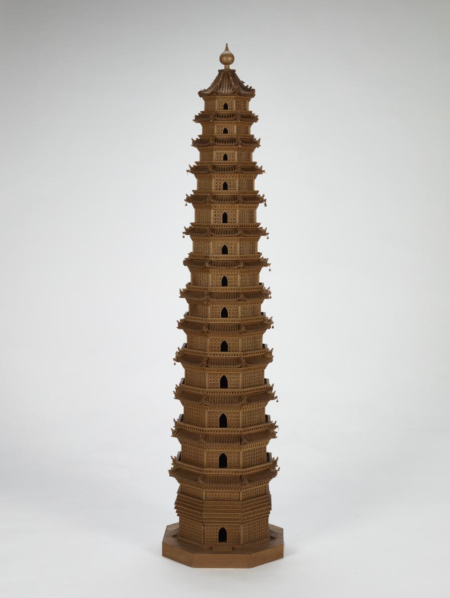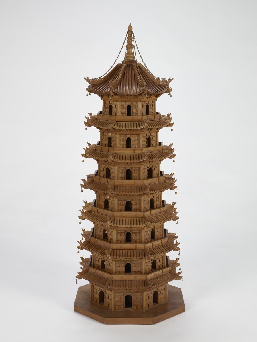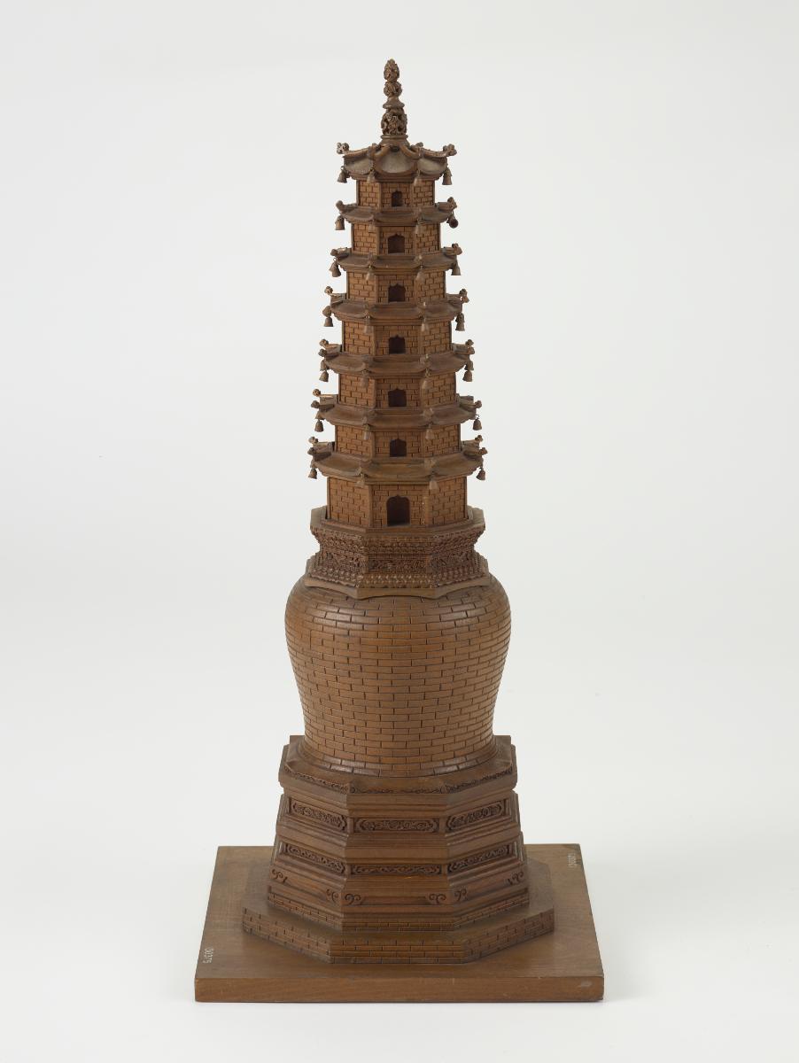 This is a model of the Thousand Idols Pagoda, also known as the All Precious Pagoda (Qianfo ta 千佛塔). The original 9-storey structure was located in the Summer Palace, Beijing, and was built during the Qing dynasty from glazed tiles. The model is one of a set of 84 carved after famous originals scattered throughout China, for the Chinese exhibition at the 1915 Panama-Pacific International Exposition (PPIE) in San Francisco, one of the first to represent the newly formed Republic of China. Scaled down at a ratio of 1:50, they were made by the Tushanwan 土山湾Workshop, a Christian orphanage in Shanghai that trained its residents in vocational art and crafts. The woodcarving workshop, supervised by the Bavarian-born Jesuit Aloysius Beck (1854-1931), employed both local and Western styles and techniques to produce figures of traditional Chinese gods alongside those of Catholic saints.