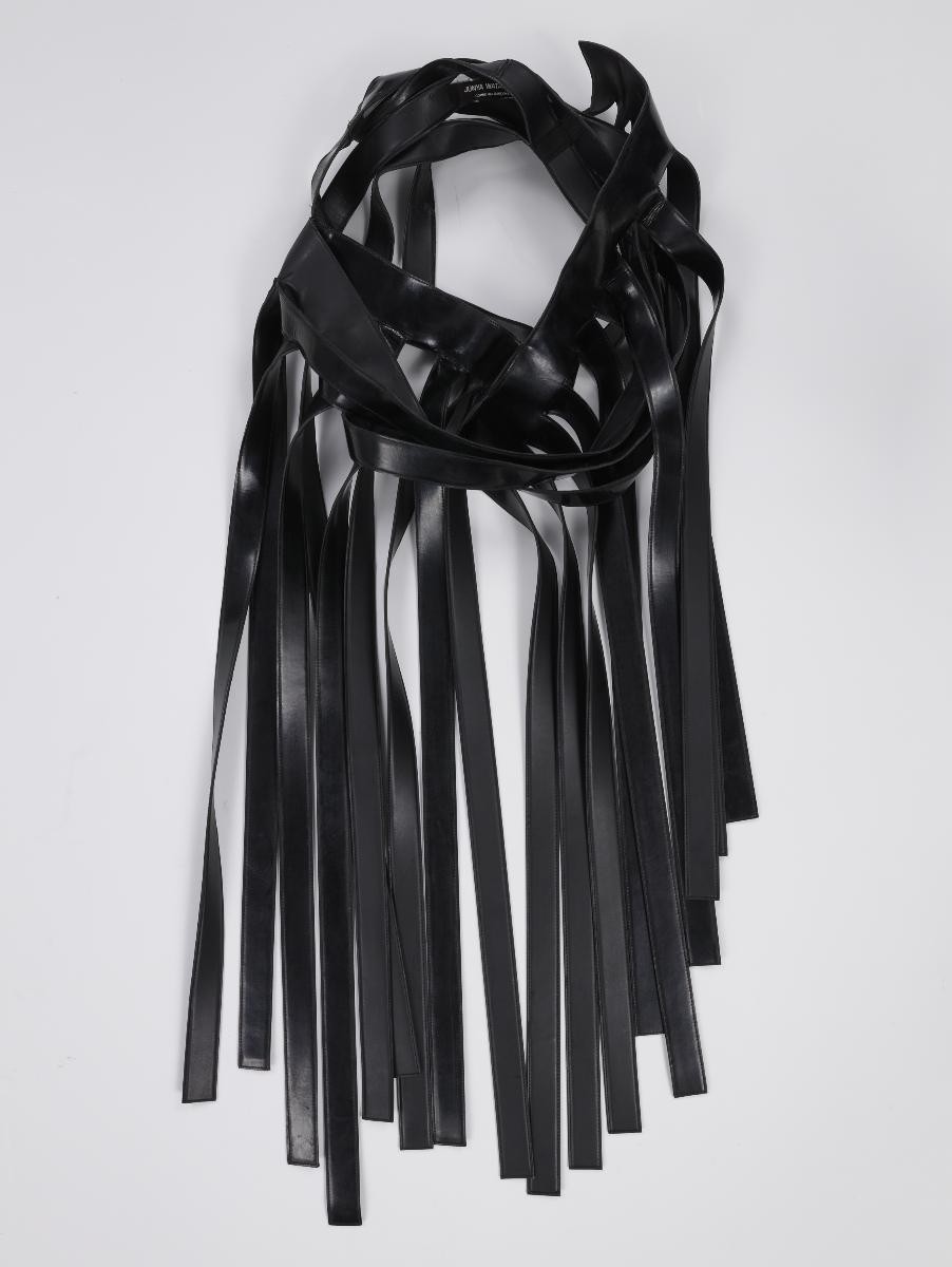 Rei Kawakubo founded Comme des Garçons in 1969 and debuted in Paris in 1981, scandalising the fashion world with her unconventional designs. Kawakubo introduced punk elements into her work in the 1990s, including design elements such as bondage straps, transparent PVC and leather. These elements recurred through her shows including "Bad Taste" in autumn-winter 2008-09 and the 2010 "Adult Delinquent" collection which featured a deconstructed harness jacket and skirt made of pieces of floral jacquard pieced together. This piece, made of white cowhide, look innocuous when viewed from the front but reveals cut outs and harness straps from the back in keeping with Kawakubo's deconstruction of fashion norms. This piece was bought by donor Lionnel Lim in the Singapore branch of Kawakubo's Dover Street Market. Lim first worked as a fashion designer-cum-merchandiser for local and regional manufacturers and later switched to writing, styling and illustrating for newspapers and various publications.