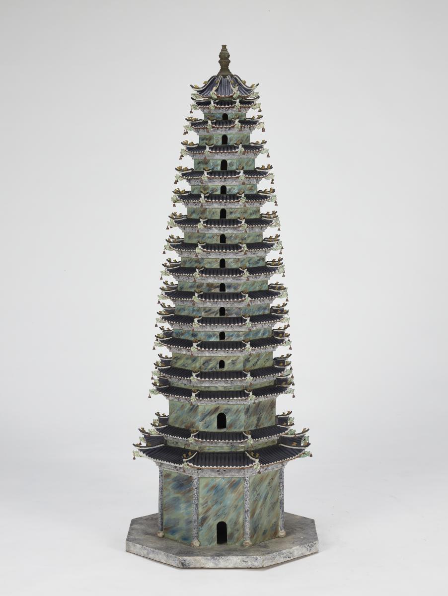 This is a model of the Pagoda of Prosperity (Xinglong ta 兴隆塔) located in Yanzhou, Shandong. The 7-storey pagoda is made of bricks and stucco and was built during the Tang dynasty.The model is one of a set of 84 carved after famous originals scattered throughout China, for the Chinese exhibition at the 1915 Panama-Pacific International Exposition (PPIE) in San Francisco, one of the first to represent the newly formed Republic of China. Scaled down at a ratio of 1:50, they were made by the Tushanwan 土山湾Workshop, a Christian orphanage in Shanghai that trained its residents in vocational art and crafts. The woodcarving workshop, supervised by the Bavarian-born Jesuit Aloysius Beck (1854-1931), employed both local and Western styles and techniques to produce figures of traditional Chinese gods alongside those of Catholic saints.