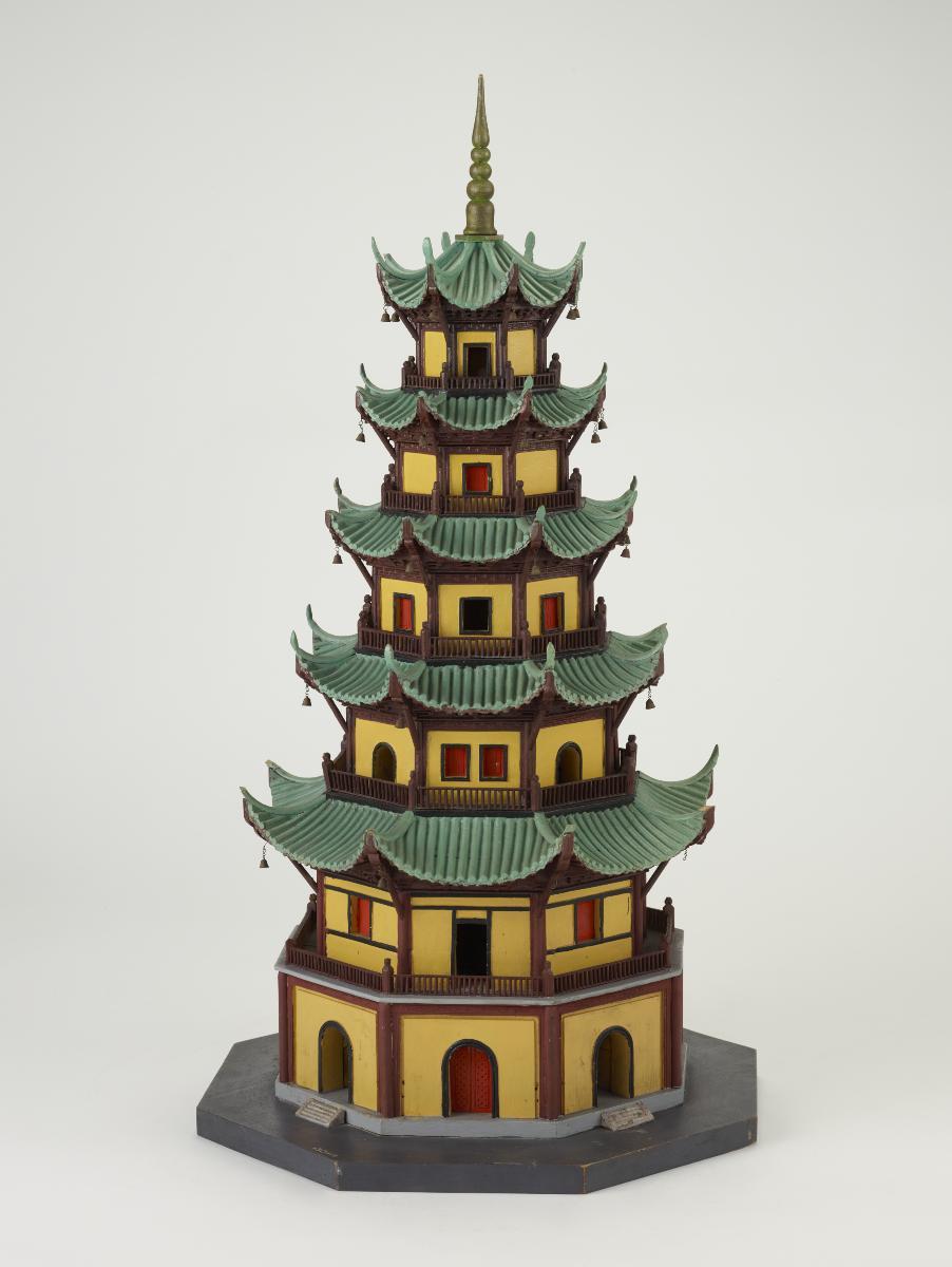 This is a model of the Wenfeng Pagoda 文峰塔which was built during the Qianlong Emperor’s reign (1732-1795) in Anyang, Henan. The 5-storey brick pagoda is 38.1 metres tall. The model is one of a set of 84 carved after famous originals scattered throughout China, for the Chinese exhibition at the 1915 Panama-Pacific International Exposition (PPIE) in San Francisco, one of the first to represent the newly formed Republic of China. Scaled down at a ratio of 1:50, they were made by the Tushanwan 土山湾Workshop, a Christian orphanage in Shanghai that trained its residents in vocational art and crafts. The woodcarving workshop, supervised by the Bavarian-born Jesuit Aloysius Beck (1854-1931), employed both local and Western styles and techniques to produce figures of traditional Chinese gods alongside those of Catholic saints.