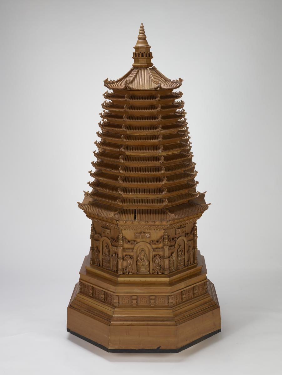 This is a model of the Big Wild Goose Pagoda (Dayan ta 大雁塔), which was built in Xi’an (Chang’an), the capital of the Tang dynasty, in 652 A.D. The 7-storey pagoda was constructed using bricks and measures 42 metres tall. The model is one of a set of 84 carved after famous originals scattered throughout China, for the Chinese exhibition at the 1915 Panama-Pacific International Exposition (PPIE) in San Francisco, one of the first to represent the newly formed Republic of China. Scaled down at a ratio of 1:50, they were made by the Tushanwan 土山湾Workshop, a Christian orphanage in Shanghai that trained its residents in vocational art and crafts. The woodcarving workshop, supervised by the Bavarian-born Jesuit Aloysius Beck (1854-1931), employed both local and Western styles and techniques to produce figures of traditional Chinese gods alongside those of Catholic saints.