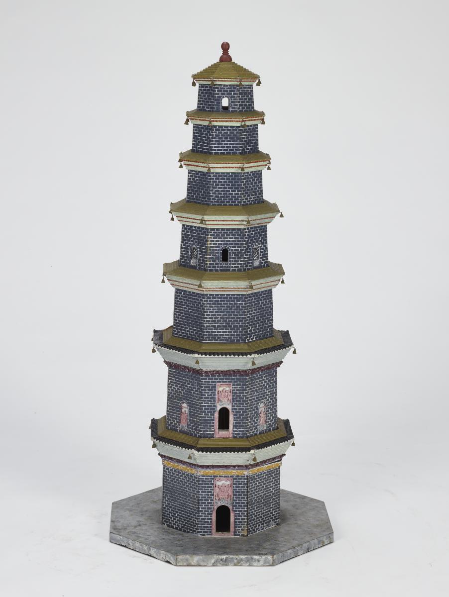 This is a model of the Square Pagoda (Fang ta 方塔). Located in Xingping, Shaanxi, the 7-storey brick pagoda measures 35 metres in height.The model is one of a set of 84 carved after famous originals scattered throughout China, for the Chinese exhibition at the 1915 Panama-Pacific International Exposition (PPIE) in San Francisco, one of the first to represent the newly formed Republic of China. Scaled down at a ratio of 1:50, they were made by the Tushanwan 土山湾Workshop, a Christian orphanage in Shanghai that trained its residents in vocational art and crafts. The woodcarving workshop, supervised by the Bavarian-born Jesuit Aloysius Beck (1854-1931), employed both local and Western styles and techniques to produce figures of traditional Chinese gods alongside those of Catholic saints.