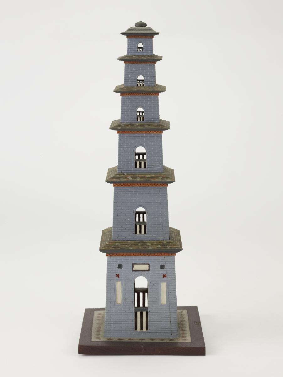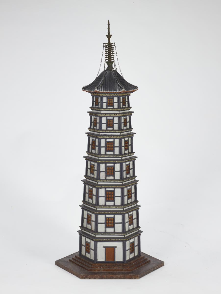 This is a model of the Pagoda of Precious Communications (Baotong ta 宝通塔). Built during the Song dynasty in Wuhan, Hubei, the pagoda measures 46.6 metres tall. The model is one of a set of 84 carved after famous originals scattered throughout China, for the Chinese exhibition at the 1915 Panama-Pacific International Exposition (PPIE) in San Francisco, one of the first to represent the newly formed Republic of China. Scaled down at a ratio of 1:50, they were made by the Tushanwan 土山湾Workshop, a Christian orphanage in Shanghai that trained its residents in vocational art and crafts. The woodcarving workshop, supervised by the Bavarian-born Jesuit Aloysius Beck (1854-1931), employed both local and Western styles and techniques to produce figures of traditional Chinese gods alongside those of Catholic saints.